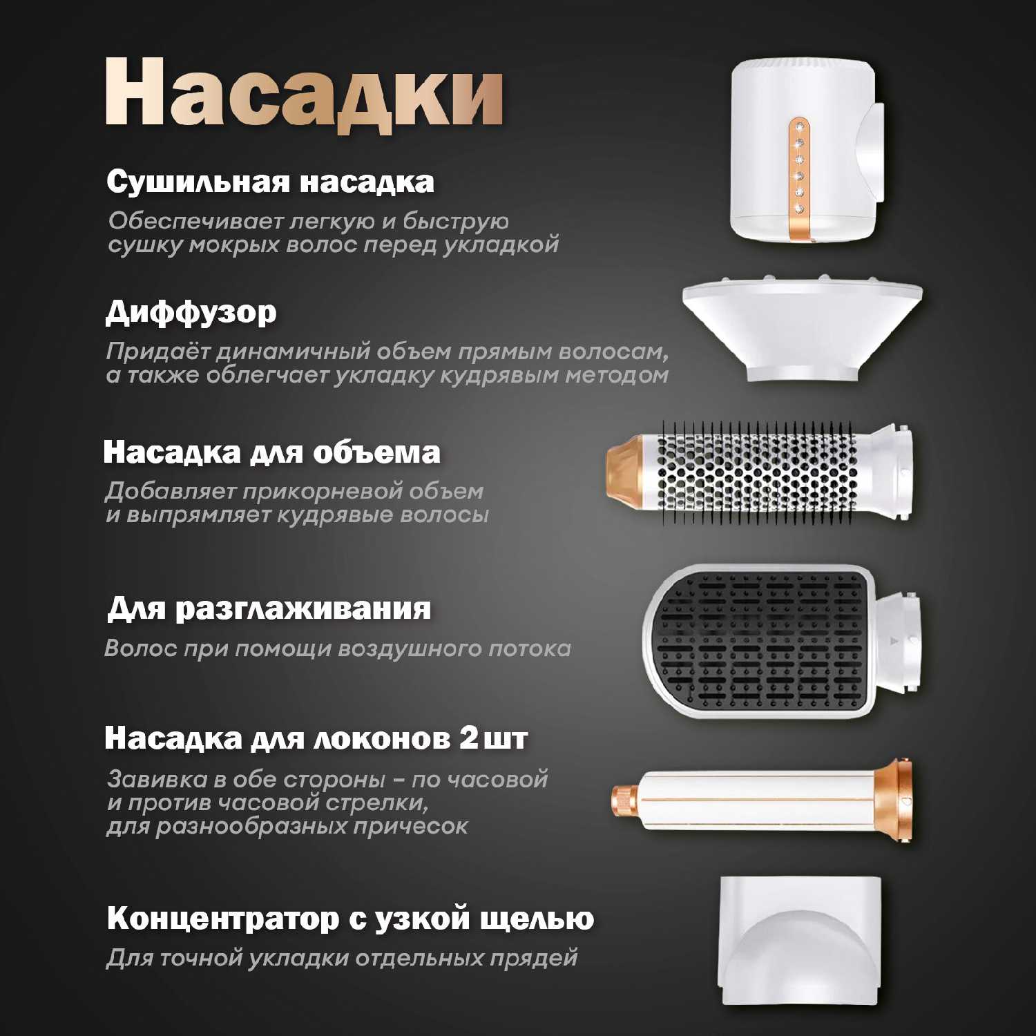 | Насадки : | диффузор, для выпрямления, для спиральной укладки, концентратор, расческа, цилиндрическая, щетка |