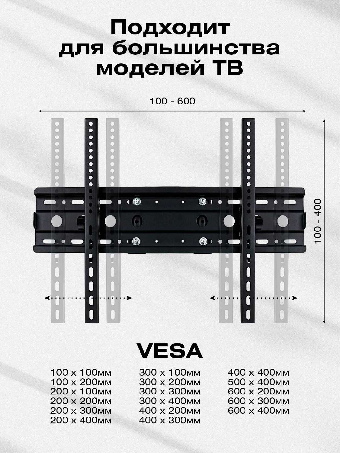| Стандарт крепления VESA : | 200x100 мм, 200x200 мм, 300x200 мм, 300x300 мм, 400x200 мм, 400x400 мм, 600x400 мм |