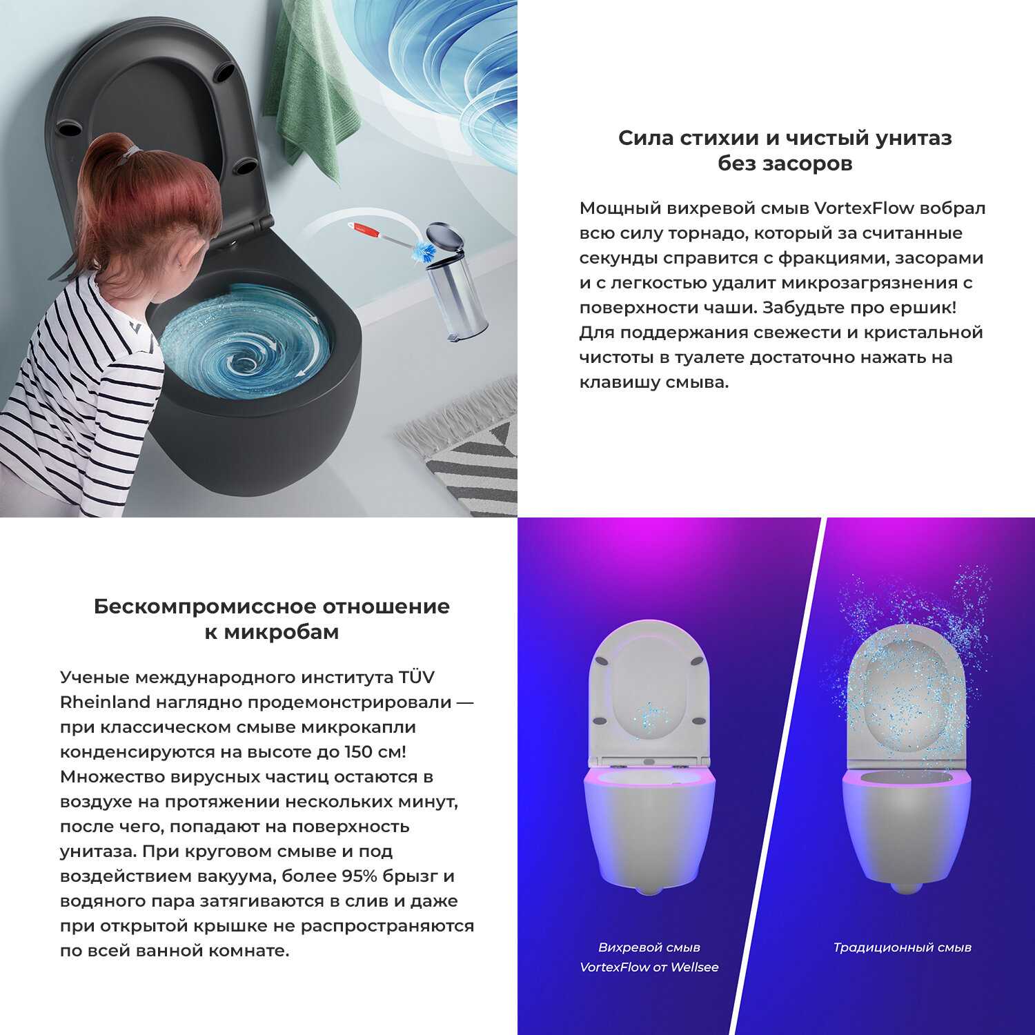 - + за такую технологию смыва-торнадо/вихрь отдельное спасибо wellsee-это отличительная особенность смыва в подвесном унитазе, которая отлично омывает чашу внутри унитаза и не расплескивает воду вокруг