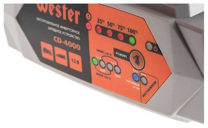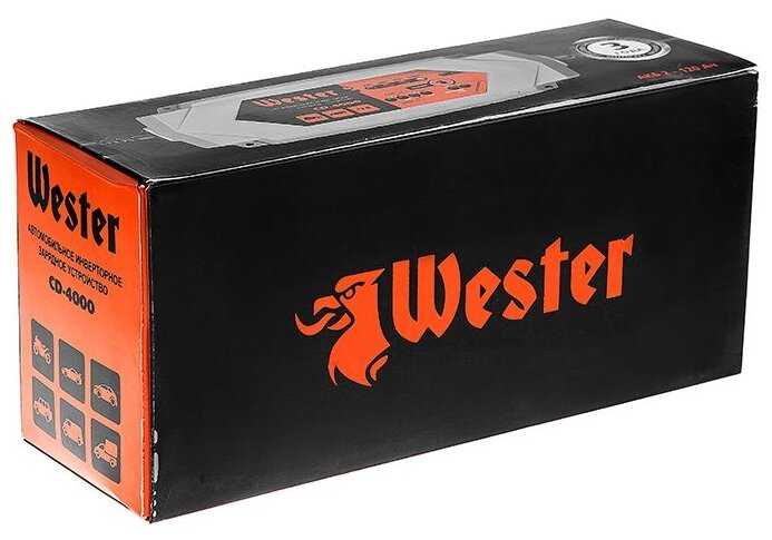 | Подробная комплектация : | 1. Зарядное устройство WESTER CD-4000 - 1шт2. Выходной кабель с клещами под АКБ - 1шт 3. Выходной кабель с клеммами под винт - 1шт4. Предохранитель 15А - 1шт5. Коробка |