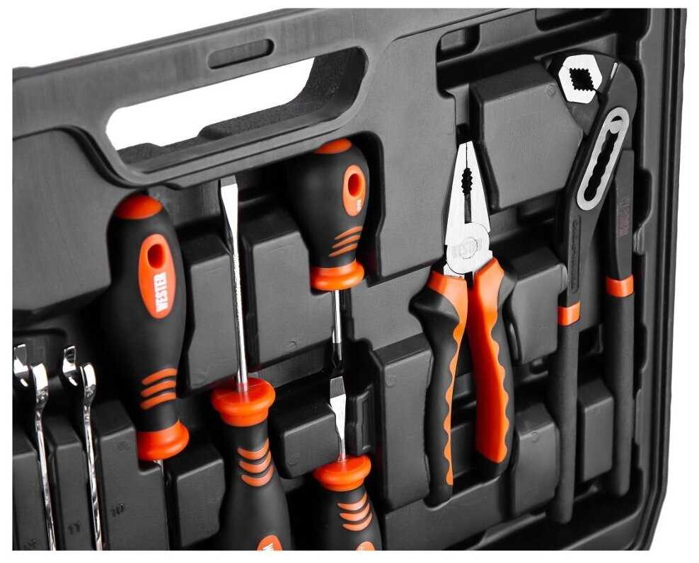 - + В наборе аж 72 инструмента. Несмотря на его вес взял его для работы на выезде. Для дома купил более компактный вариант с меньшим числом инструментов. Качеством доволен - металл ОЧЕНЬ прочный.