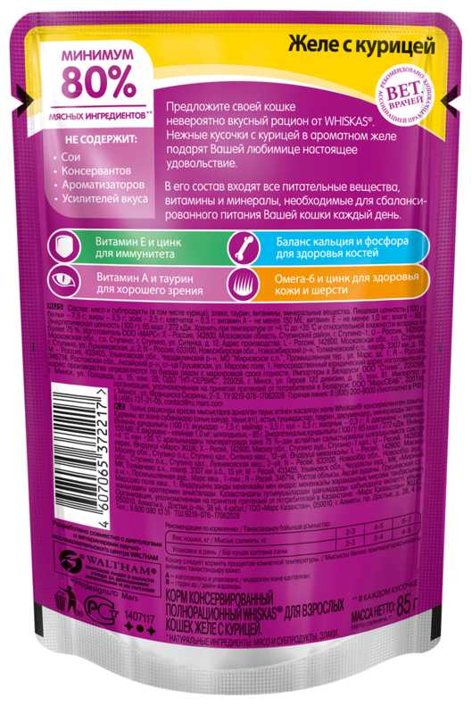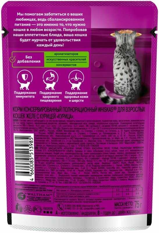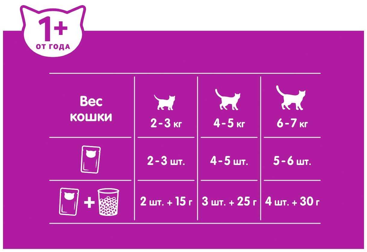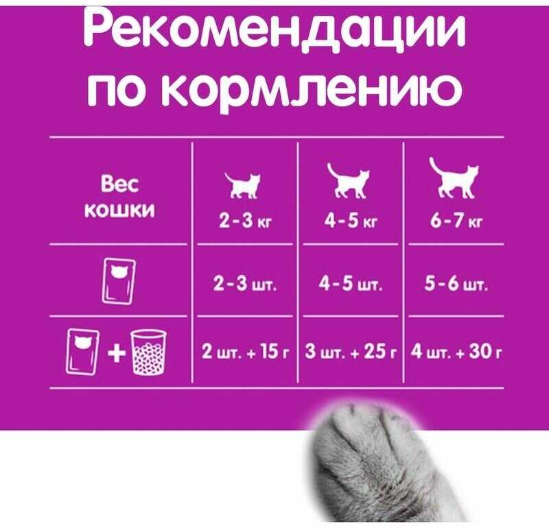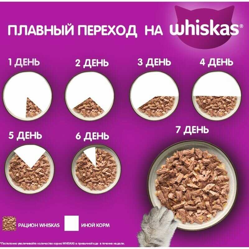 Многие дают Whiskas ежедневно, сочетая влажный с сухим: по полпачки утром и вечером плюс сухой днем. Кошки на таком рационе активны, шерсть здоровее, линька меньше, пищеварение в норме. Съедают 4 пачки в день или больше без побочек. Однако это корм эконом-класса с зерновыми и мало мяса, поэтому некоторые держат про запас как дополнение. -