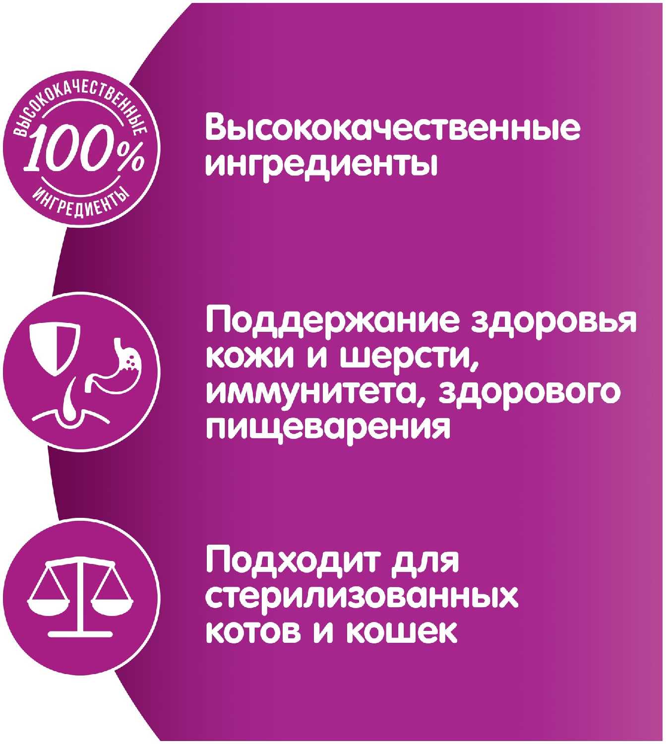 | Особые потребности : | для здоровья кожи и блеска шерсти, для стерилизованных/кастрированных, профилактика избыточного веса |