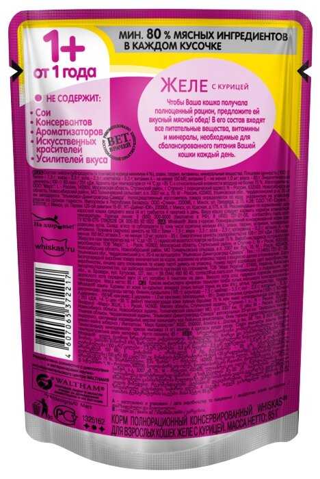 Котенок ест с аппетитом 1 паучер в день, особенно курицу. Мягкая текстура желе удобна для малышей. Сроки годности отличные, кошки довольны. Используют как основное питание. -