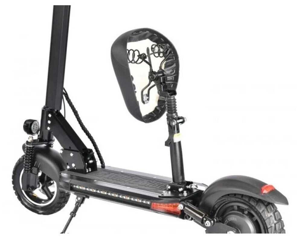 Особенности электросамоката : | дисплей, задний габарит/стоп-сигнал, индикатор заряда, индикатор скорости, ограничитель скорости, передняя фара (фонарь), подсветка, привод задний, сиденье в комплекте, съемный аккумулятор |