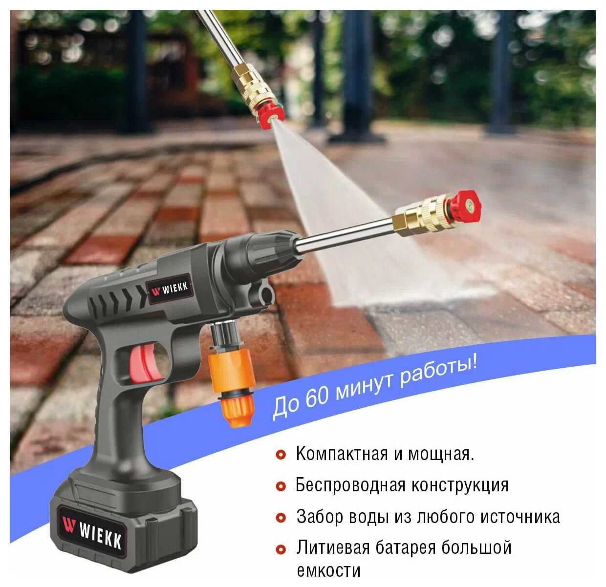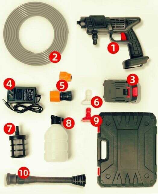 - + в общем удобная вещица. мыли парник,обувь. машину в дальней дороге частично. напор выдает неплохой , главное правильно установить насадку. в комплекте есть зарядное устройство, две насадки.все лежт в удобном кейсе