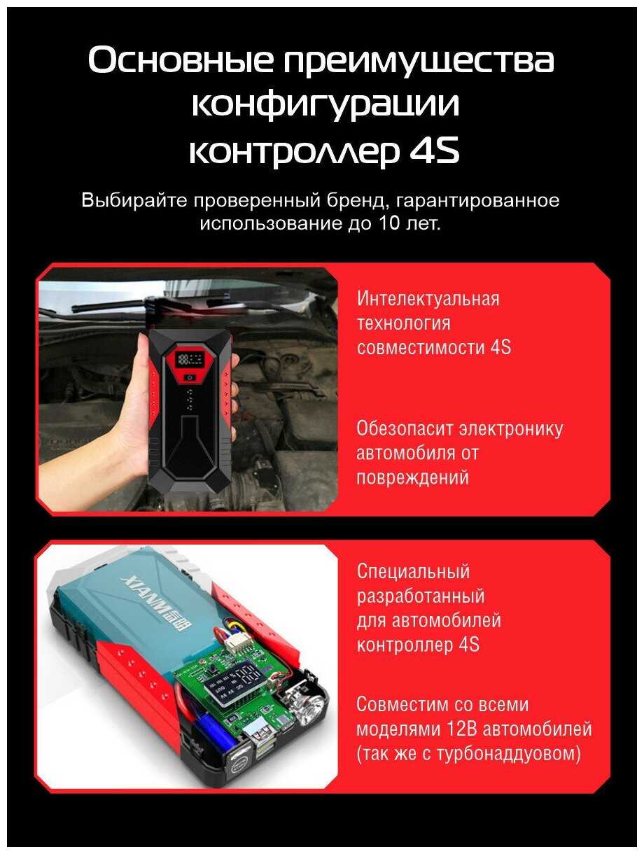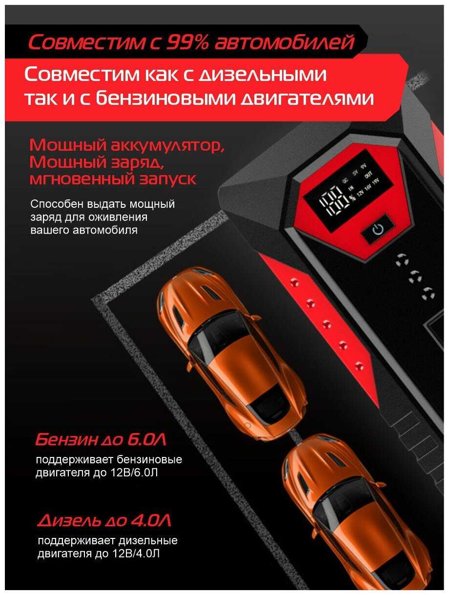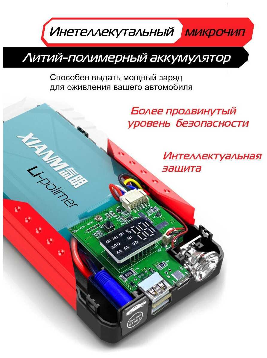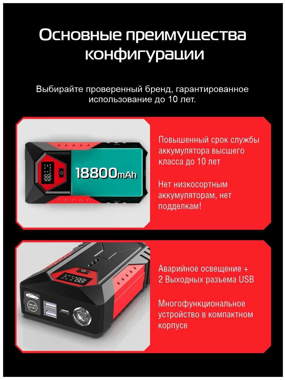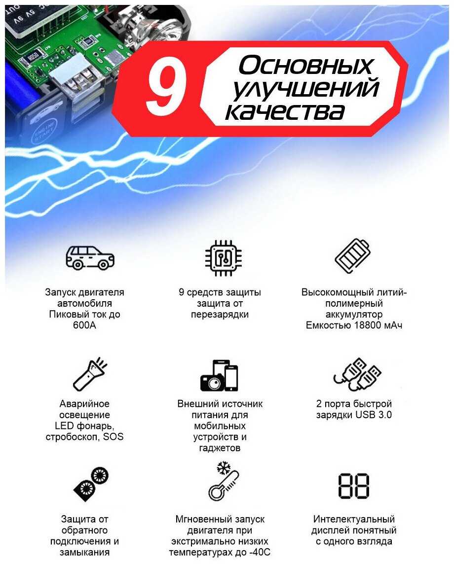 - Литий-полимерный аккумулятор 18800 мАч обеспечивает до 4-5 пусков с одного заряда при условии исправного автомобильного АКБ.