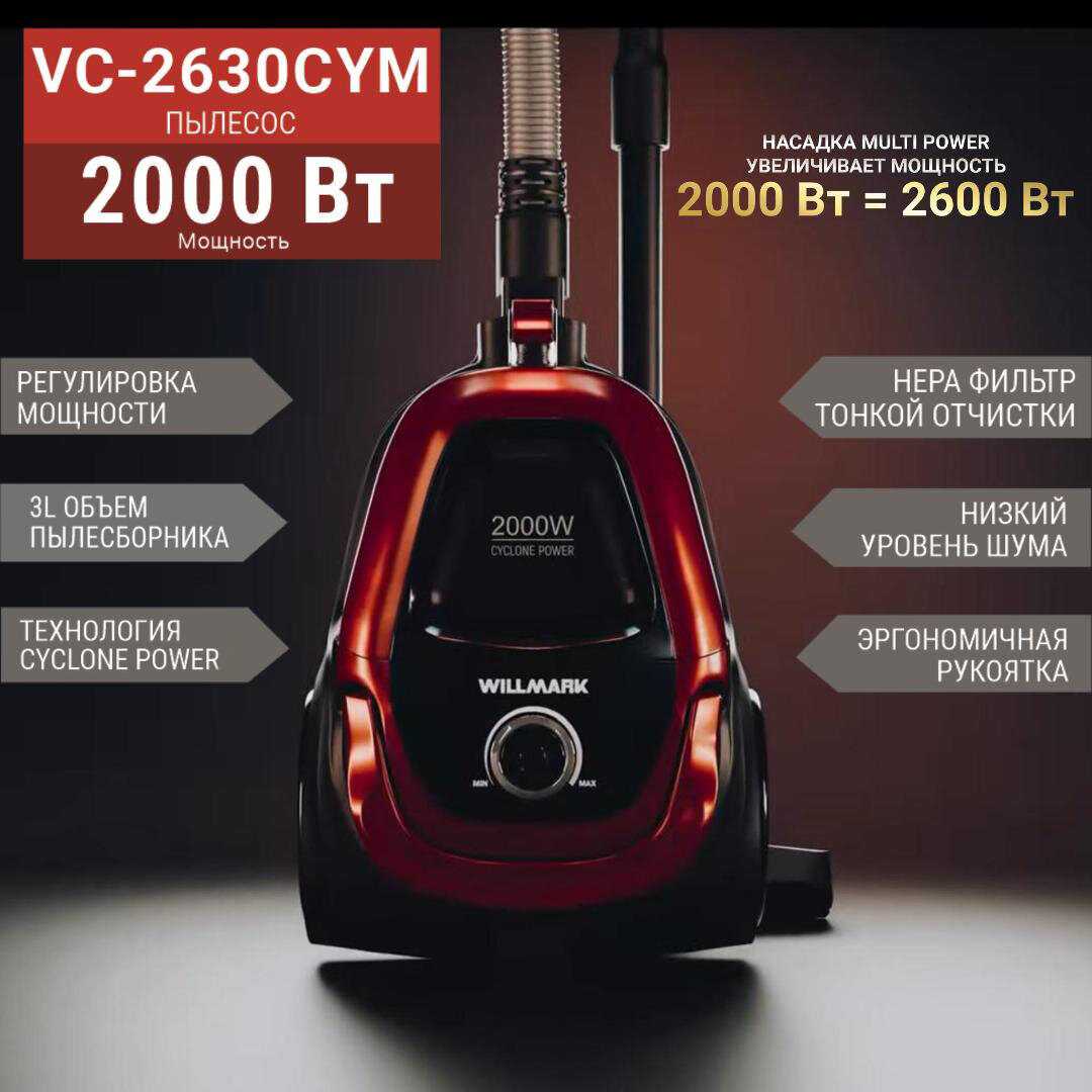 Отзывы о Пылесос WILLMARK VC-2630CYM (трубка телескоп/металл, 2000Вт, мощ. всас.450Вт, 3л, регулятор мощности)
