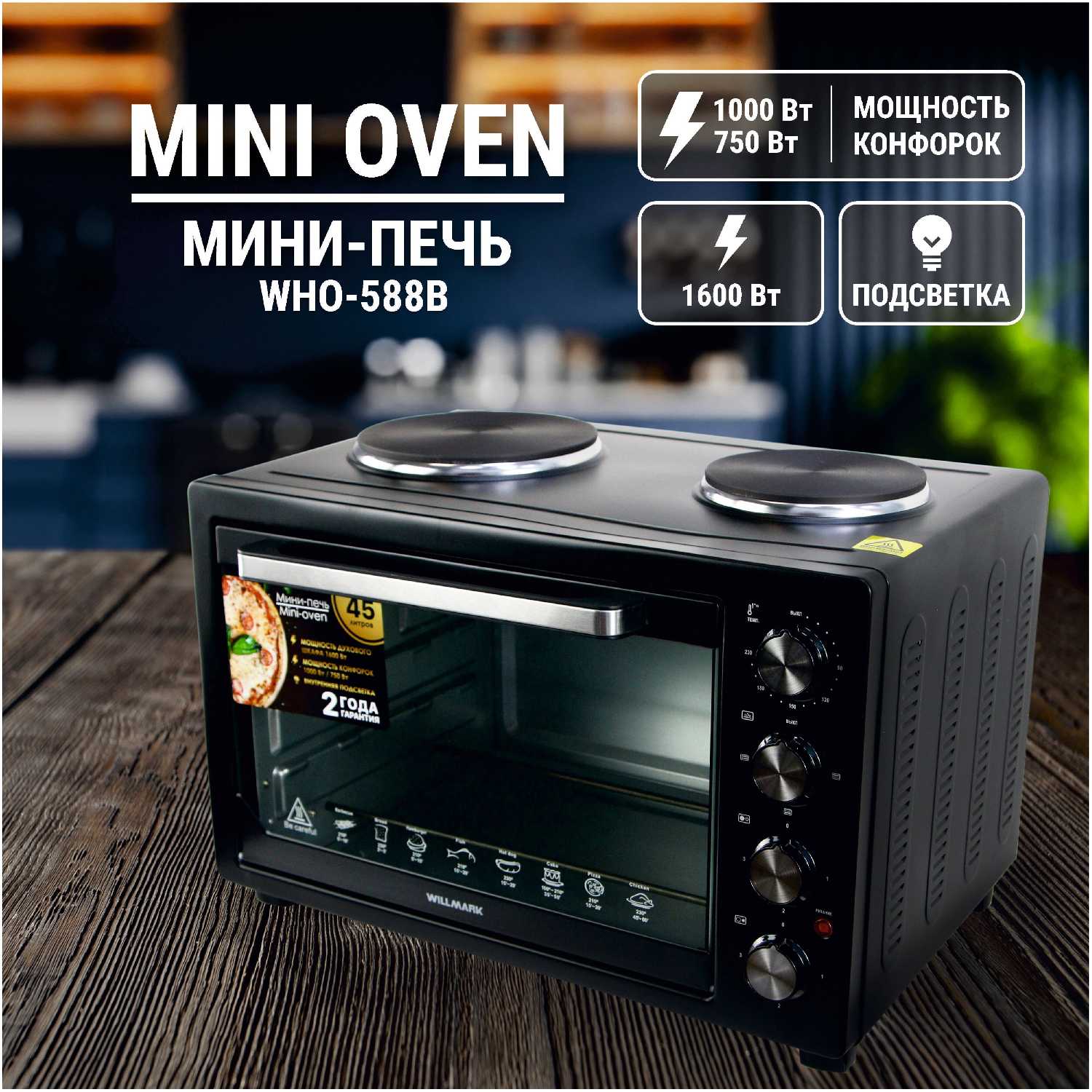 Отзывы о Мини-печь электрическая WILLMARK WHO-588B (45 литров, 2 конфорки, термостат,230С, 2450Вт, чёрный)
