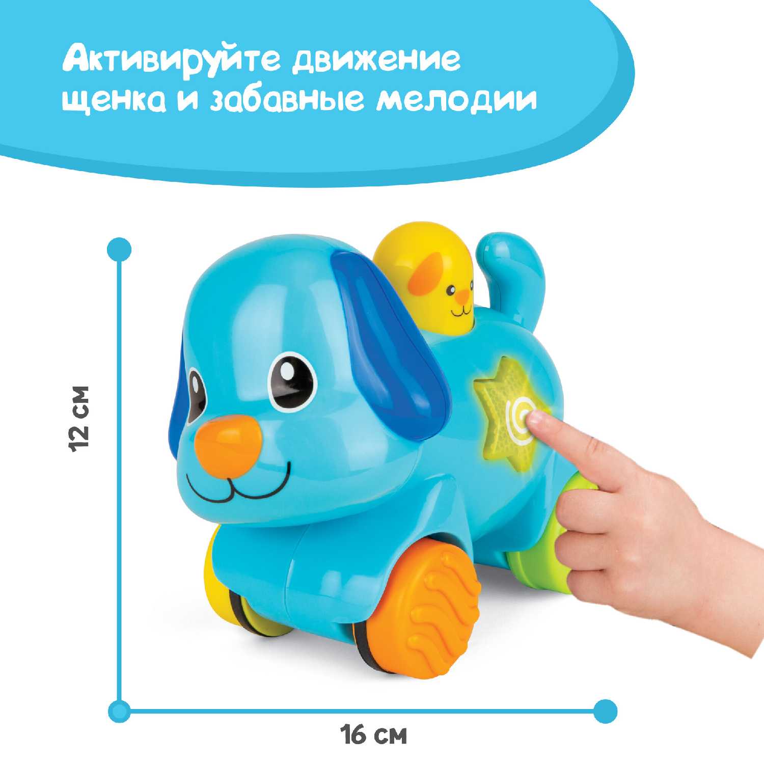 Щенок музыкальный, умеет ездить, мотает головой при этом.