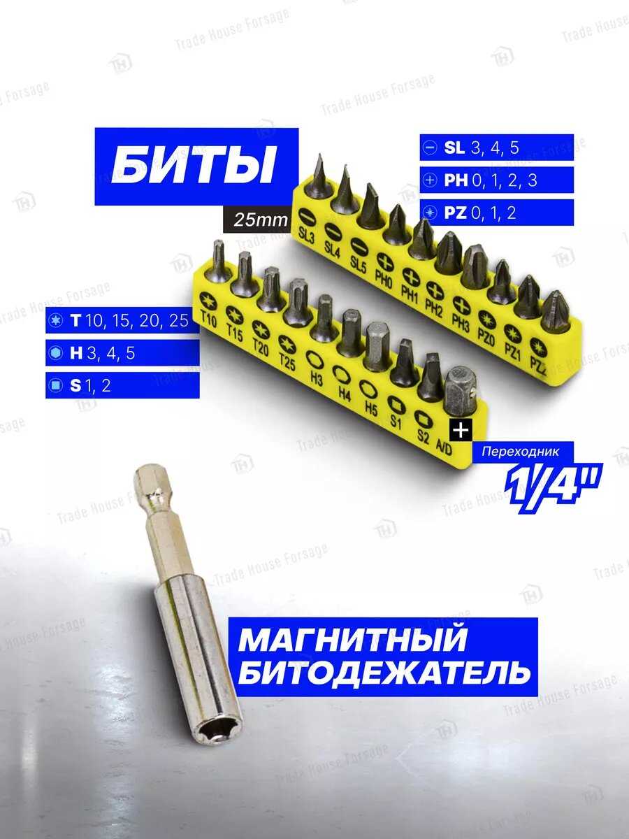 | Биты подробно : | 25 мм : SL: 3 445 555 6657 мм, PH: 0 1 2 3 4, PZ: 01 234, S: 0 1 2 3 H: 2 5 3 4 5556 T: 8 9 10 15 20 25 27 SL: 1/85/323/167/321/49/32 H: 5/323/167/321/4 AD |