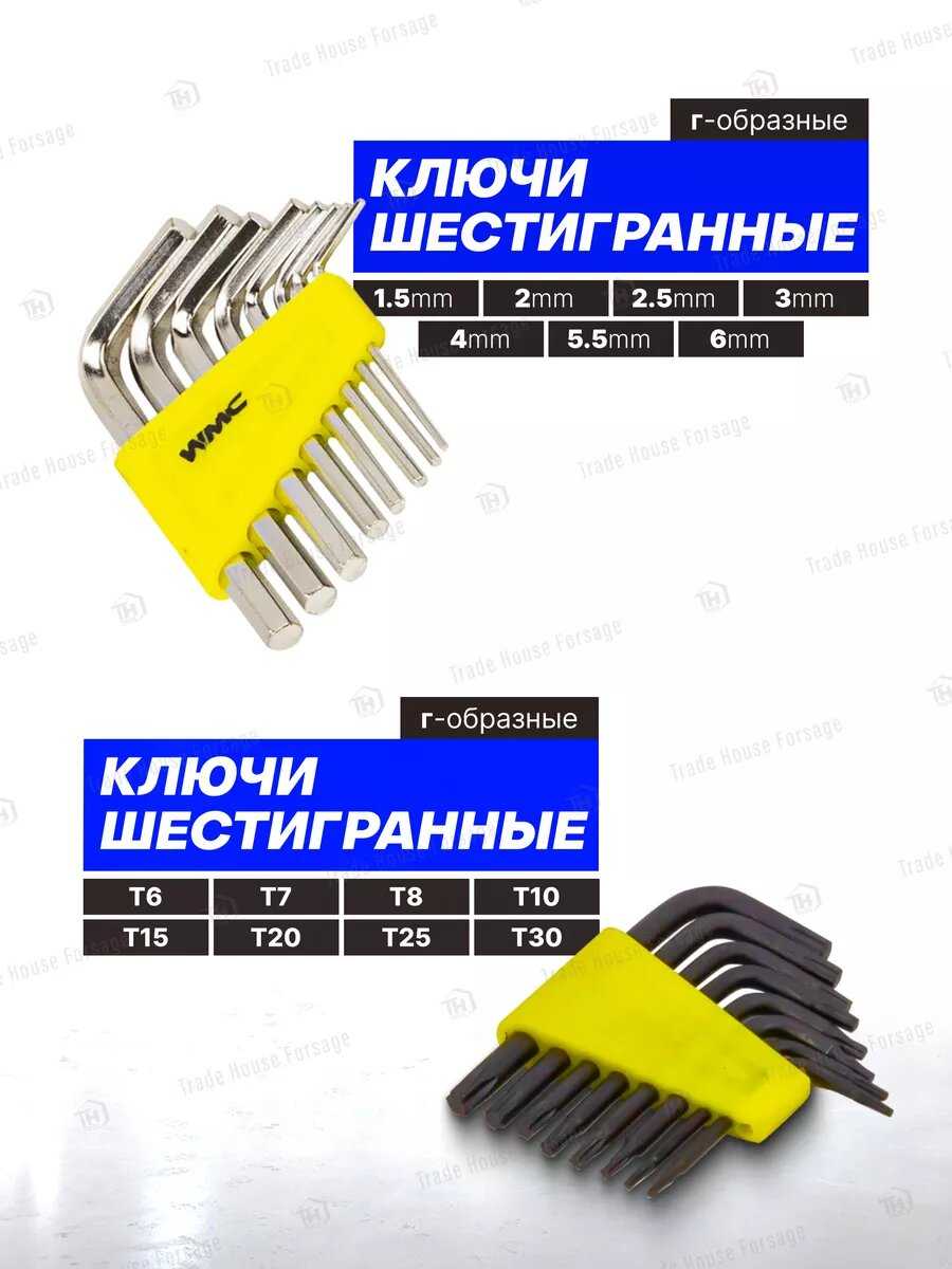 | Ключи имбусовые подробно : | Ключ шестигранный Г-образный: 1.5, 2, 2.5, 3, 4, 5.5, 6. Ключ Torx Г-образный: T8 T10 T15 T20 T25 T30. |