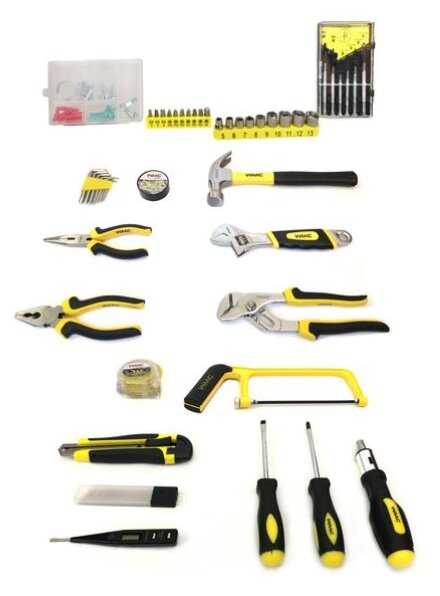 - + Красиво оформленный кейс.Много инструментов,причем самых необходимых в дом.обиходе.Кусачки,пассатижи,молоток.рулетка,и пробник эл.тока.
