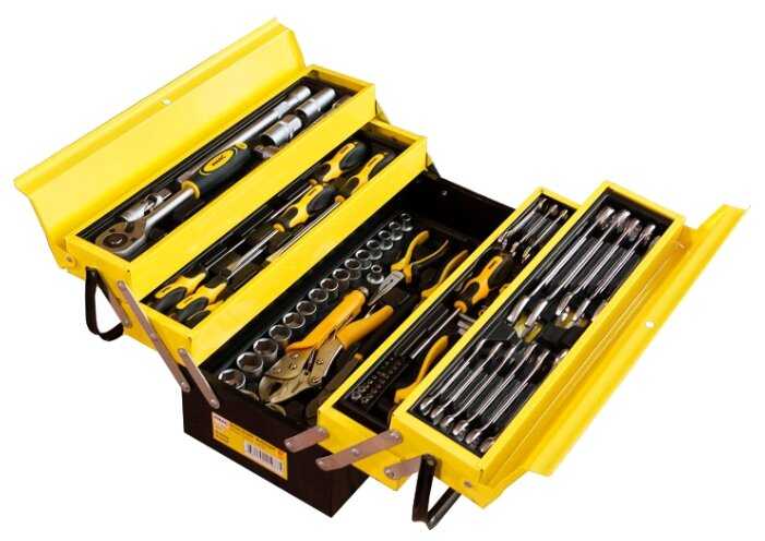 | Инструменты в комплекте : | вороток для головок, длинногубцы, клещи, ключ переставной гаечный, ключи гаечные, кусачки, отвёртки, пассатижи, плоскогубцы, трещотка |