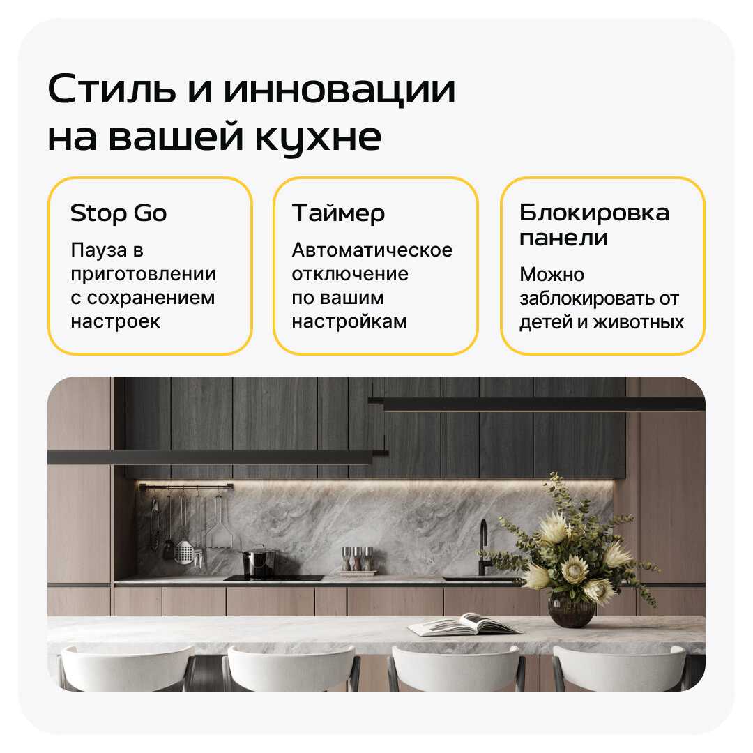 Отдельно хочется отметить простоту ухода — поверхность легко очищается от загрязнений, особенно если протирать сразу после готовки. Кнопки и сенсорные элементы работают без задержек.
