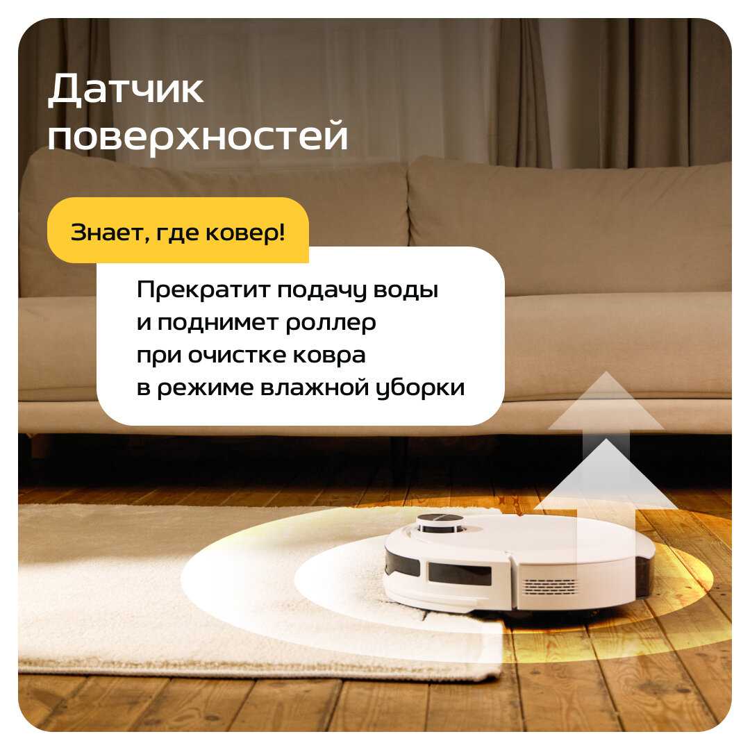- Датчики препятствий обнаруживают мебель и объекты, снижая скорость перед столкновением для минимизации повреждений.