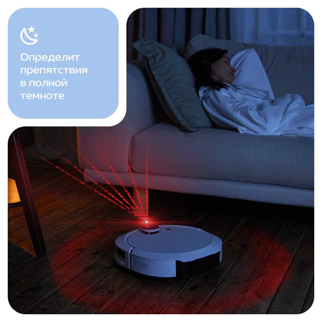 - Позволяет запускать уборку ночью или во время работы из дома без создания акустического дискомфорта.