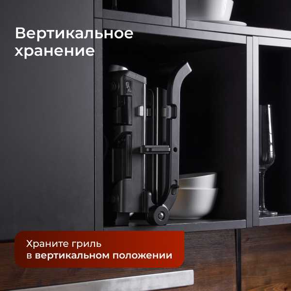 Гриль разработан для компактного хранения в вертикальном положении, что значительно экономит пространство на кухне. Пользователи подтверждают, что в таком виде он занимает минимум места на полке или в шкафу. Эргономичная конструкция позволяет легко убирать прибор после использования, делая его идеальным решением для небольших кухонь. -