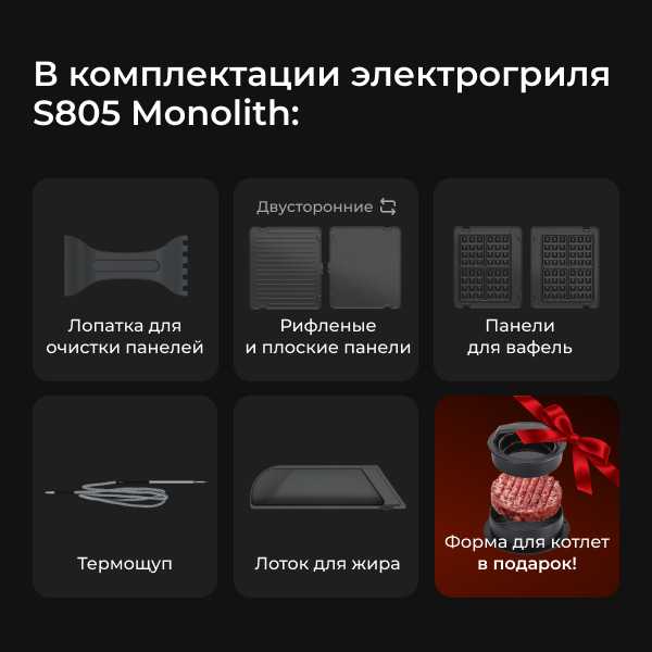 Комплектация включает три сменные панели различного назначения, включая вафельницу, форму для бургеров и стандартные гриль-панели. Также в набор входят электронный термощуп, скребок для очистки и книга рецептов. Такое разнообразие аксессуаров позволяет готовить широкий спектр блюд без необходимости докупать дополнительные приспособления. -