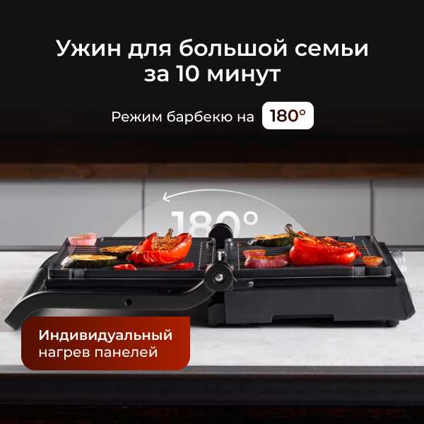 - Мощность нагревательных элементов обеспечивает достижение рабочей температуры за 2-3 минуты, сокращая время ожидания перед готовкой.