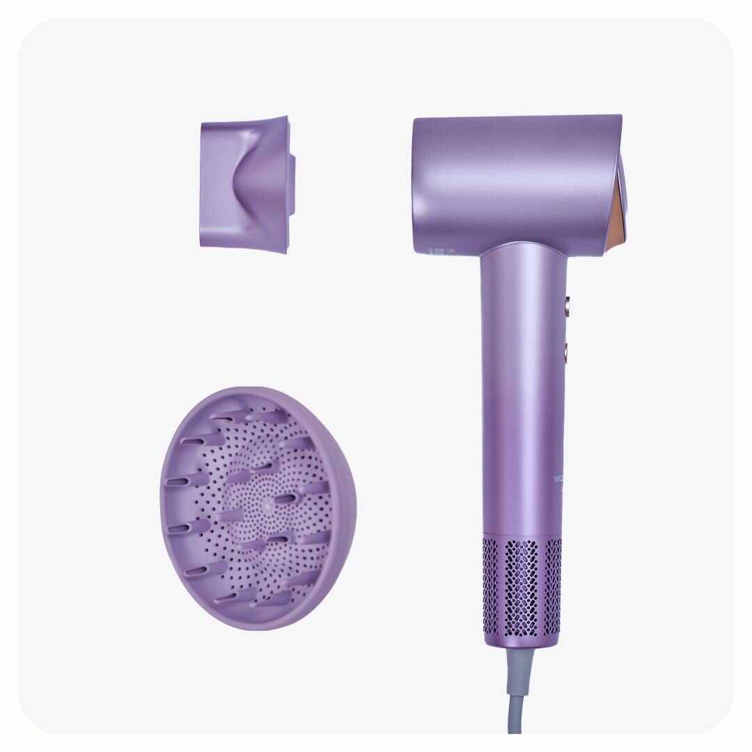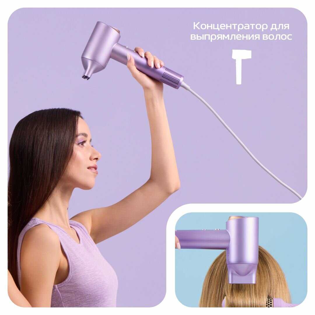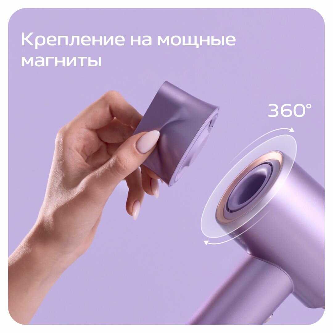 - + Фен был хорошо упакован в дополнительную белую коробку и пленку. Стильный, красивый, приятного фиолетового цвета, легкий. Особенно понравились насадки на магнитах и режим со сменой горячего и холодного воздуха.
