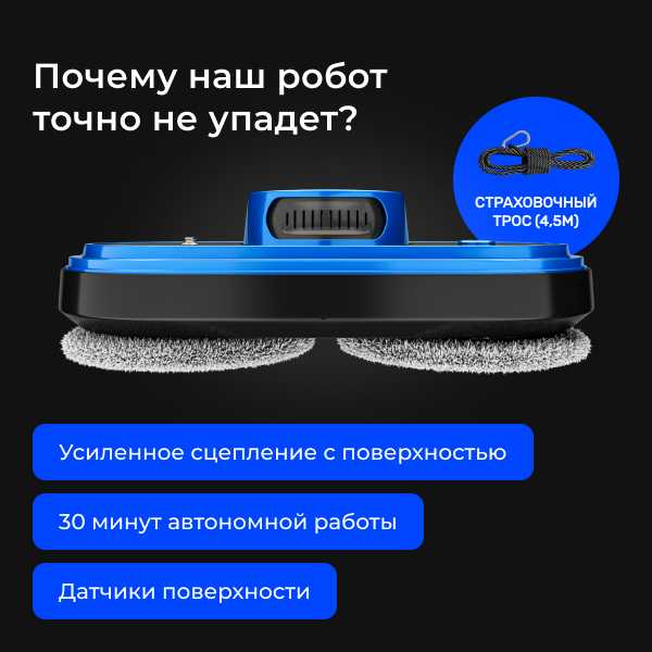 Вакуумная система обеспечивает надёжное сцепление даже на гладком стекле высотных окон. Пользователи отмечают, что при стандартной загрязнённости срыв происходит редко, особенно если предварительно сбрызнуть поверхность моющим раствором. Для сложных случаев (сильные загрязнения, текстурированное стекло) рекомендуется запускать робота после ручного увлажнения проблемных зон. -