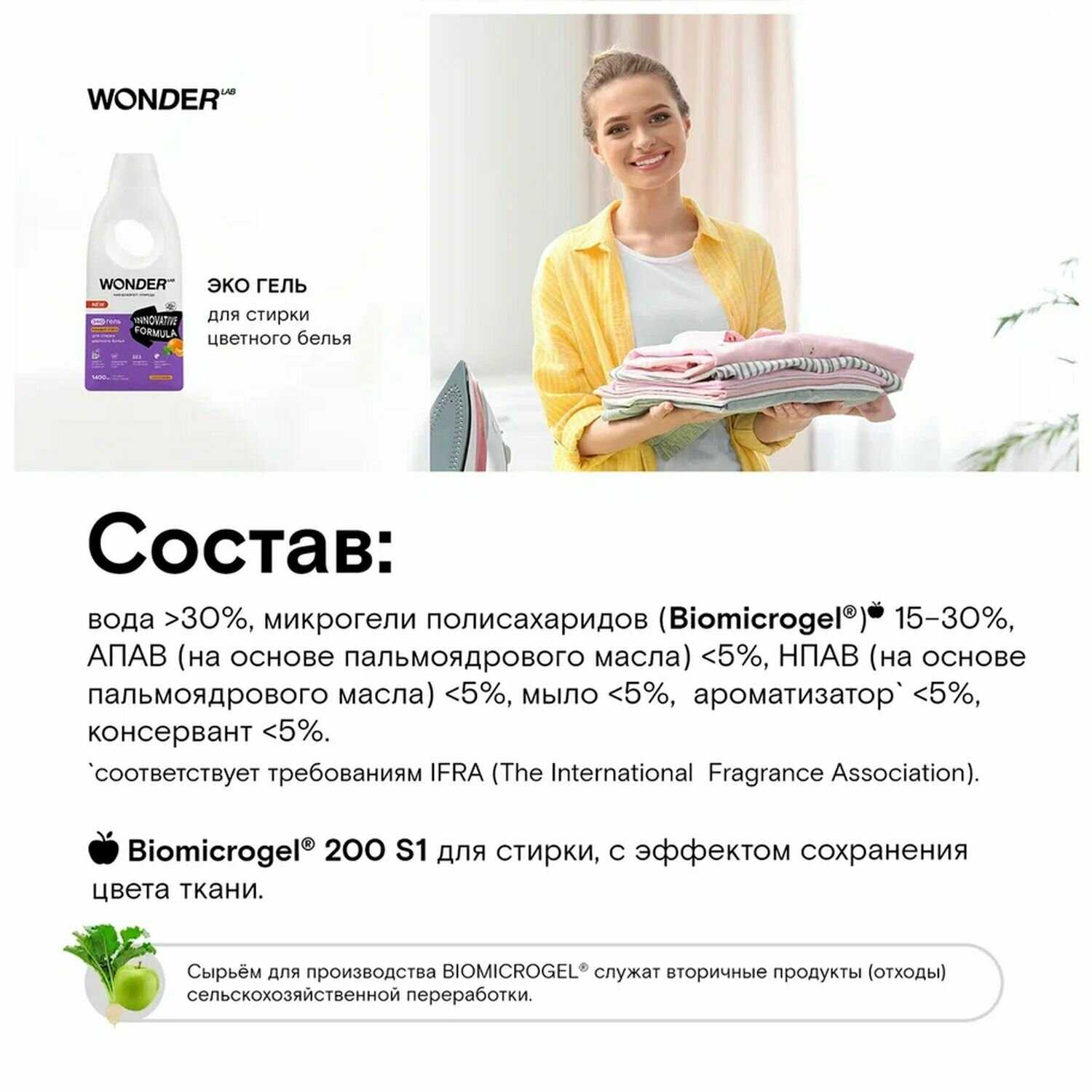| Состав : | вода >30%, микрогели полисахаридов (Biomicrogel®) 15–30%, АПАВ (на основе пальмоядрового масла) <5%, НПАВ (на основе пальмоядрового масла) <5%, мыло <5%, ароматизатор` <5%, консервант <5%. `соответствует требованиям IFRA (The International Fragrance Association). Biomicrogel 200 S3 для стирки, с эффектом сохранения цвета ткани. |