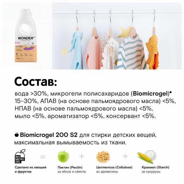 | Состав : | Вода >30%, микрогели полисахаридов (Biomicrogel) 15−30%, АПАВ (на основе пальмоядрового масла) <5%, НПАВ (на основе пальмоядрового масла) <5%, мыло <5%, ароматизатор <5%, консервант <5%. Biomicrogel 200 S2 для стирки детских вещей, максимальная вымываемость из ткани. |