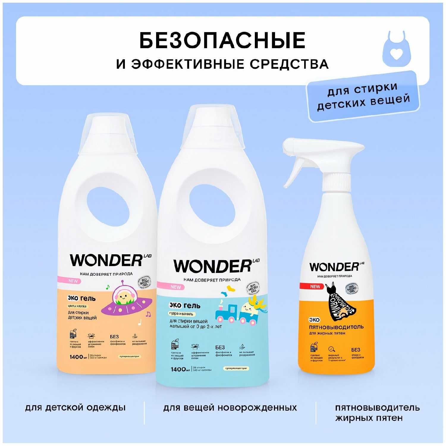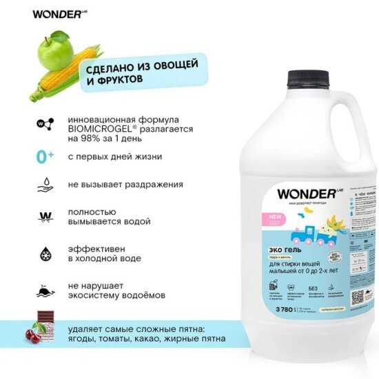 У ребенка чувствительная кожа, подобрать средство для стирки вещей было тяжело. Вандер лаб выпускает экологичные средства, созданные на основе овощей и фруктов (жома свекольного, яблочного жмыха, кукурузы и прочего).