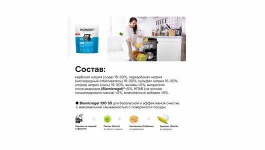 | Состав : | карбонат натрия (сода) 15-30%, перкарбонат натрия (кислородный отбеливатель) 15-30%, сульфат натрия 15-30%, хлорид натрия (соль) 15-30%, энзимы <5%, микрогели полисахаридов (Biomicrogel) <5%, НПАВ (на основе пальмоядрового масла) <5%, комплексные добавки <5%. Biomicrogel 100 S5 для безопасной и эффективной очистки, с максимальной смываемостью с поверхности посуды. |
