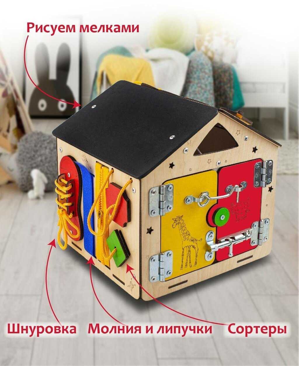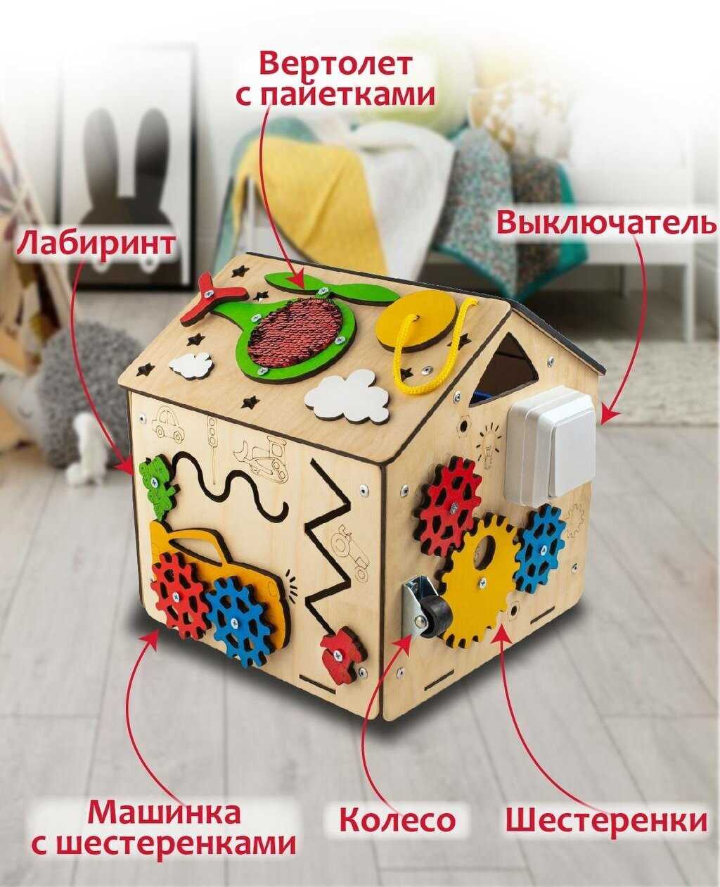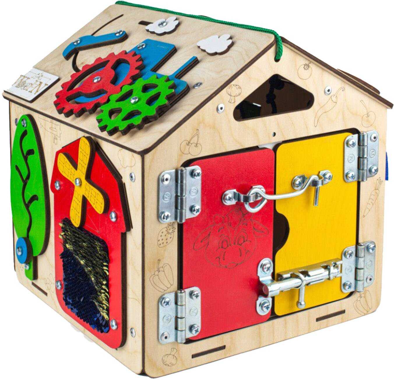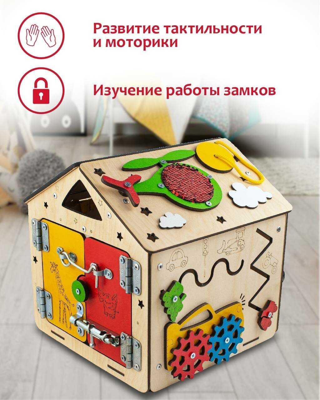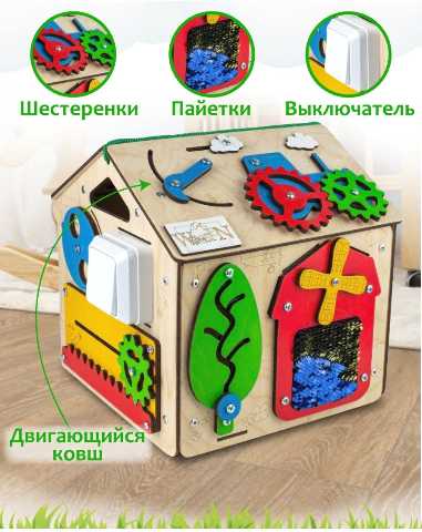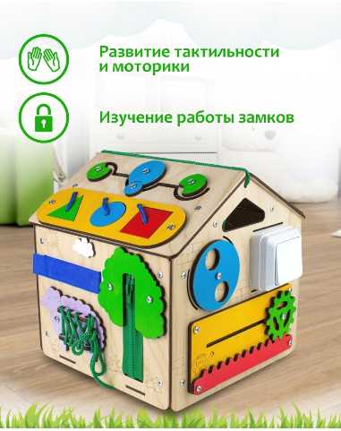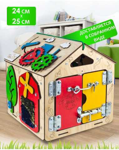 - + Отличный домик! красиво и аккуратно сделан! все уголки закруглённые, детали держатся прочно все (кроме выключателя ). Понравился всем, взрослым и детям! Маленький 11 мес, рассматривал долго, изучал и дергал детали на шнурках (квадратики),держатся.Замки пока сложно, будут интересны чуть позже! и еще не доглядели😀 в манеже ребенок залез на домик ногами и попрыгал, он выдержал 👍 стенки домика крепкие!