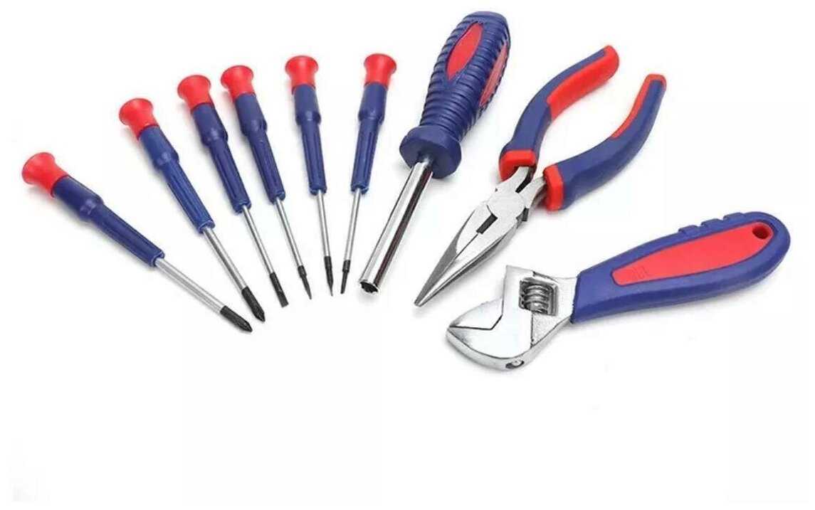 Инструменты в комплекте : | вороток для головок, ключ разводной, ключи гаечные, молоток, отвёртки, отвёртки для точных работ, пассатижи, плоскогубцы, рукоять для головок, трещотка |