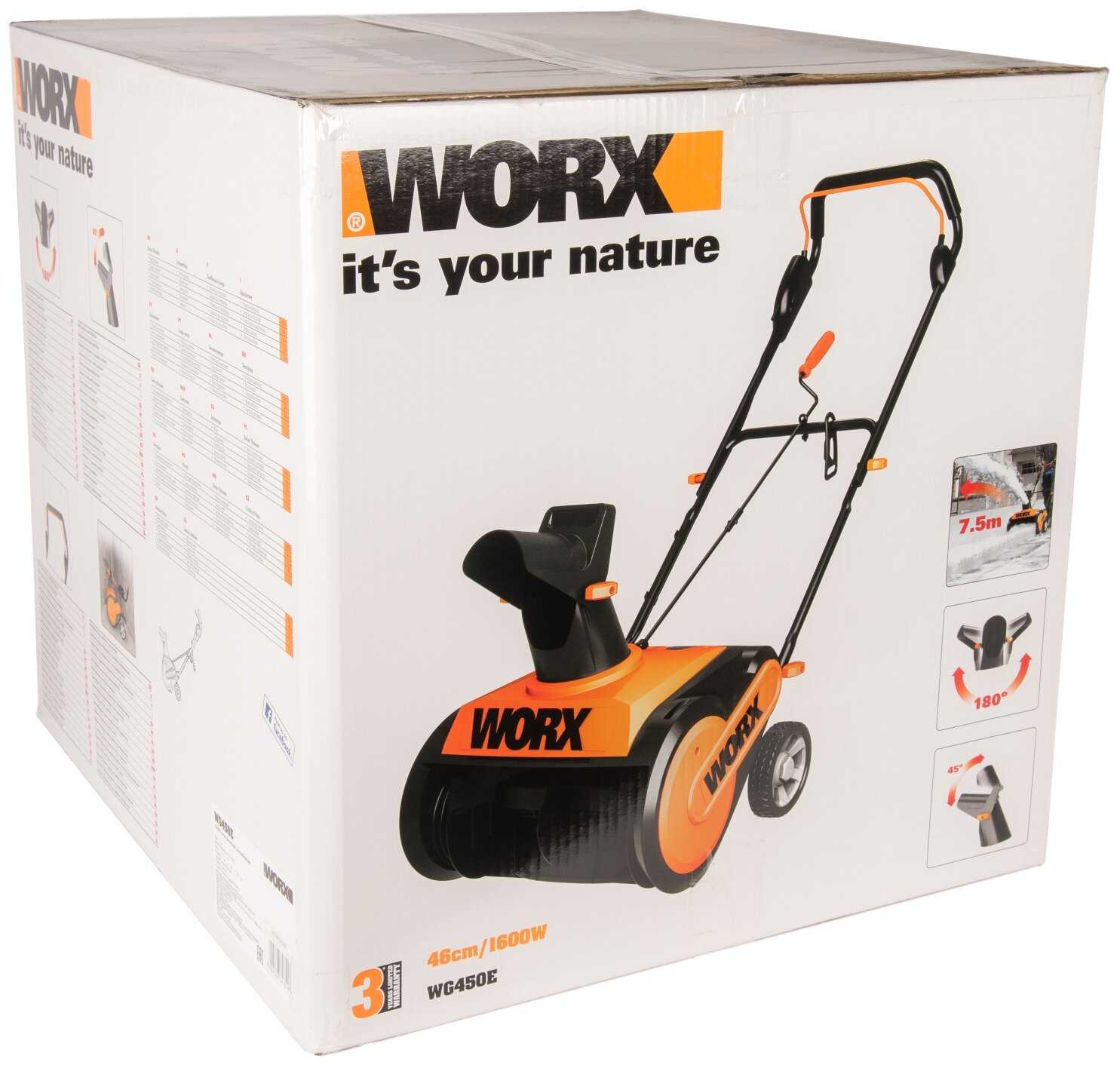 | Подробная комплектация : | Снегоуборщик сетевой Worx WG450E, 3 кабельных зажима, 4 ручки блокировки рукоятки, Коробка. |