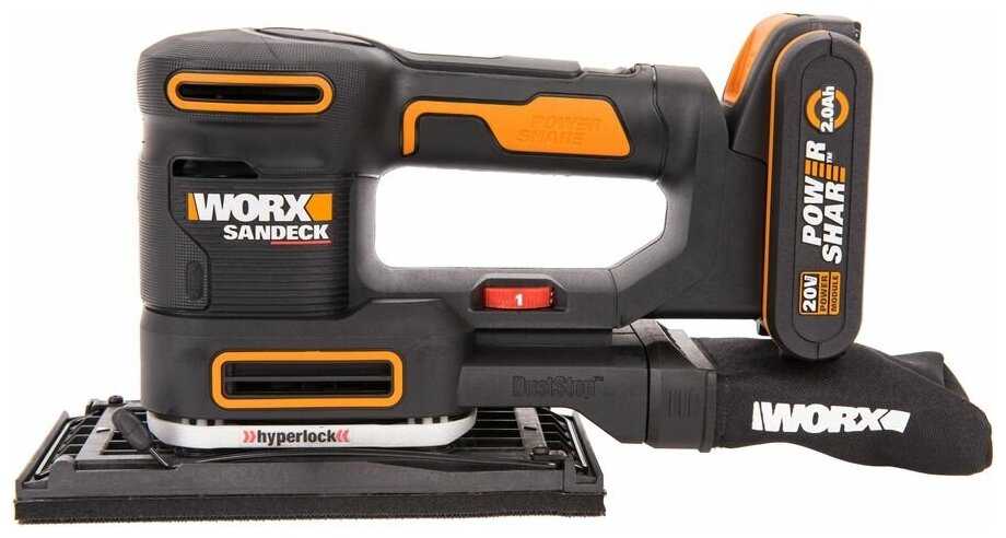 В комплекте поставляется аккумулятор емкостью 2,0 А·ч, которого хватает на 45-60 минут интенсивного шлифования, что достаточно для большинства домашних проектов средней сложности, таких как шлифовка комода или нескольких дверных коробок. Батарея заряжается примерно за один час с помощью прилагаемого зарядного устройства. Важным преимуществом является совместимость с системой Power Share, что позволяет использовать один и тот же аккумуляторный блок с другими инструментами и садовой техникой Worx. -