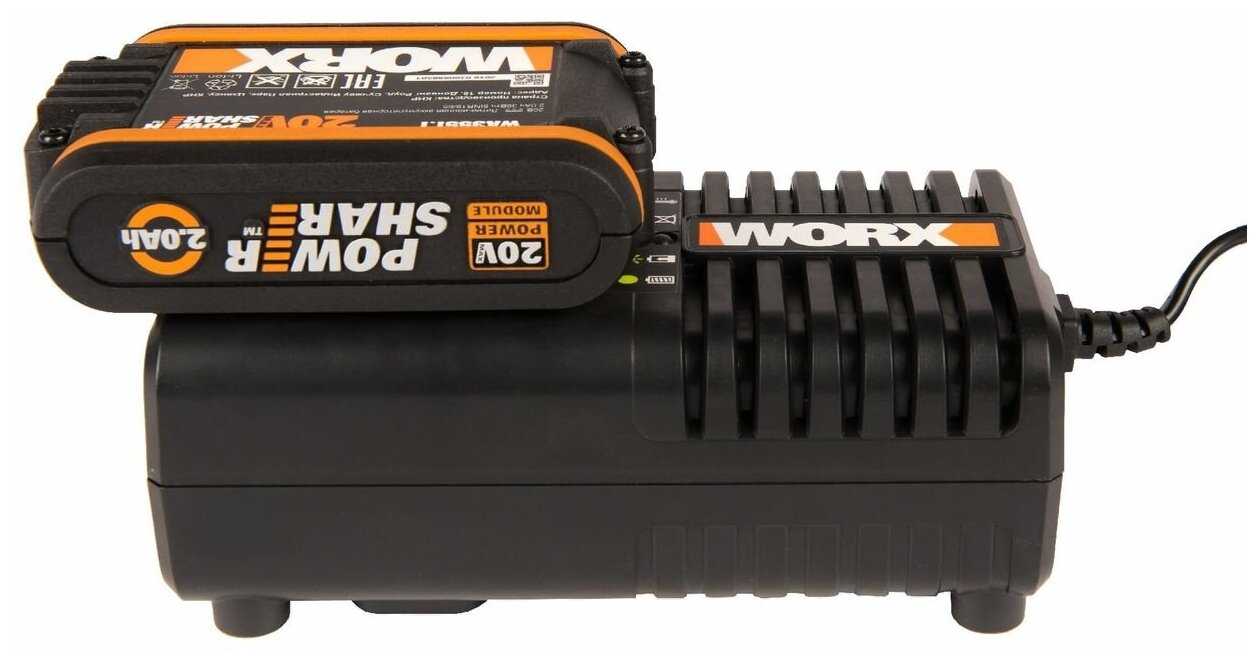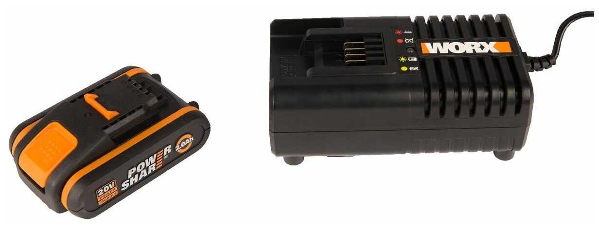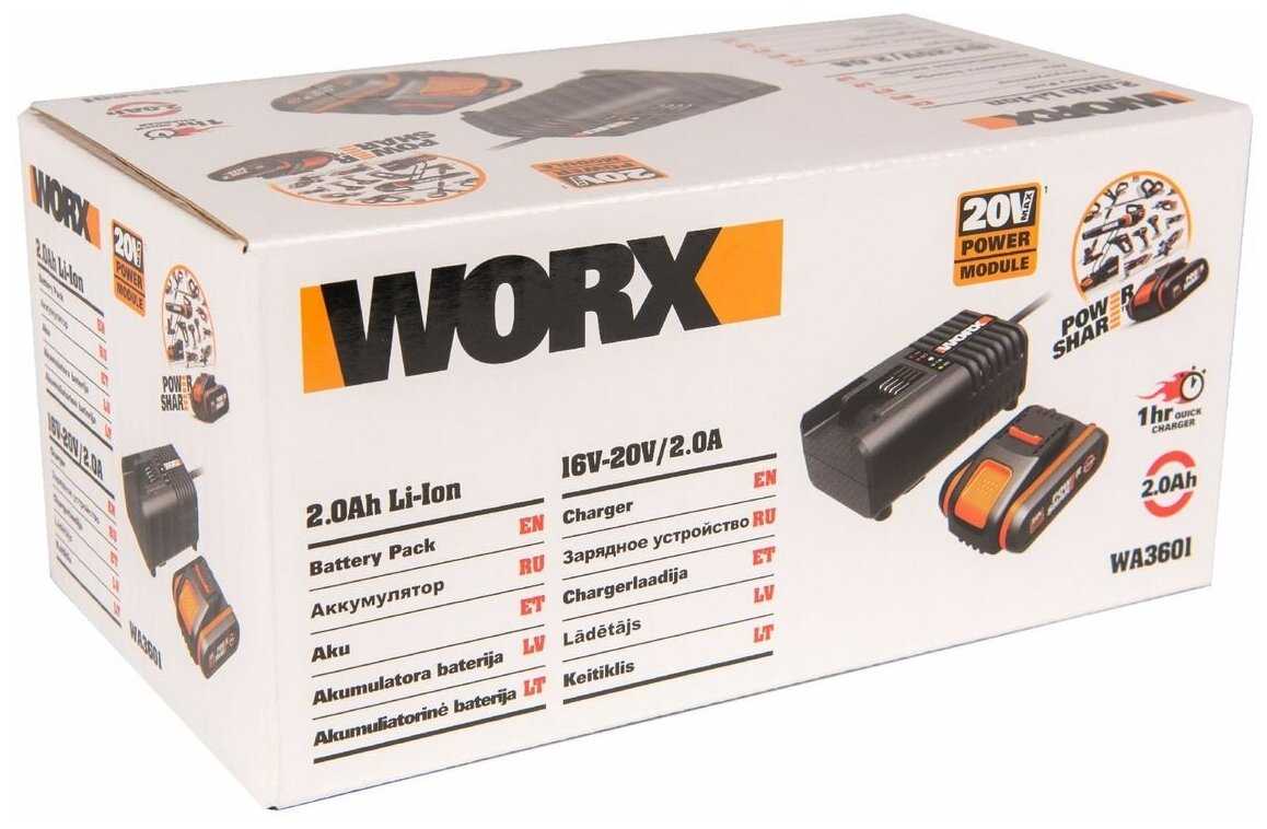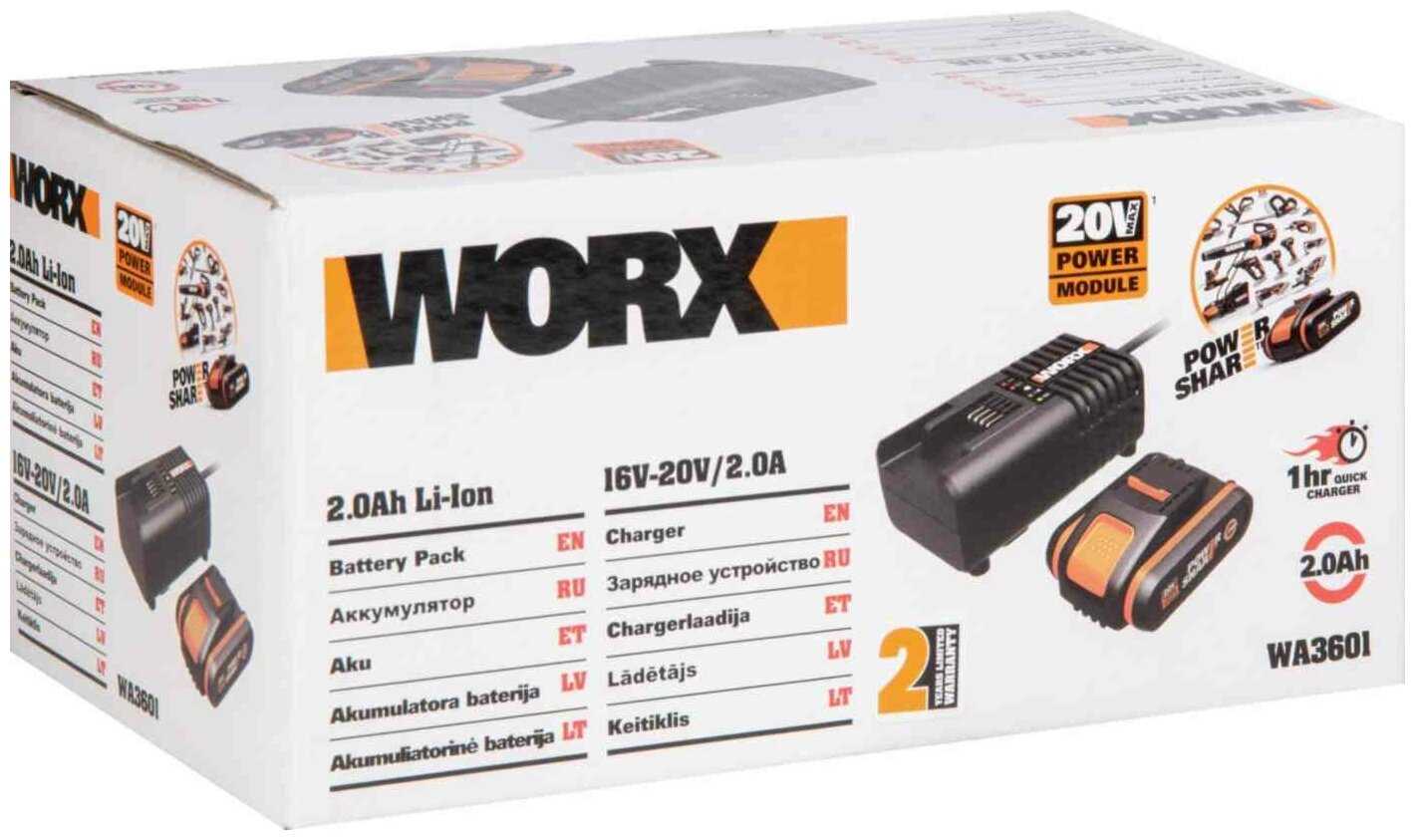 | Дополнительная информация : | Зарядное устройство Worx 3601, батарея 20 В Li-ion 2 Ач |