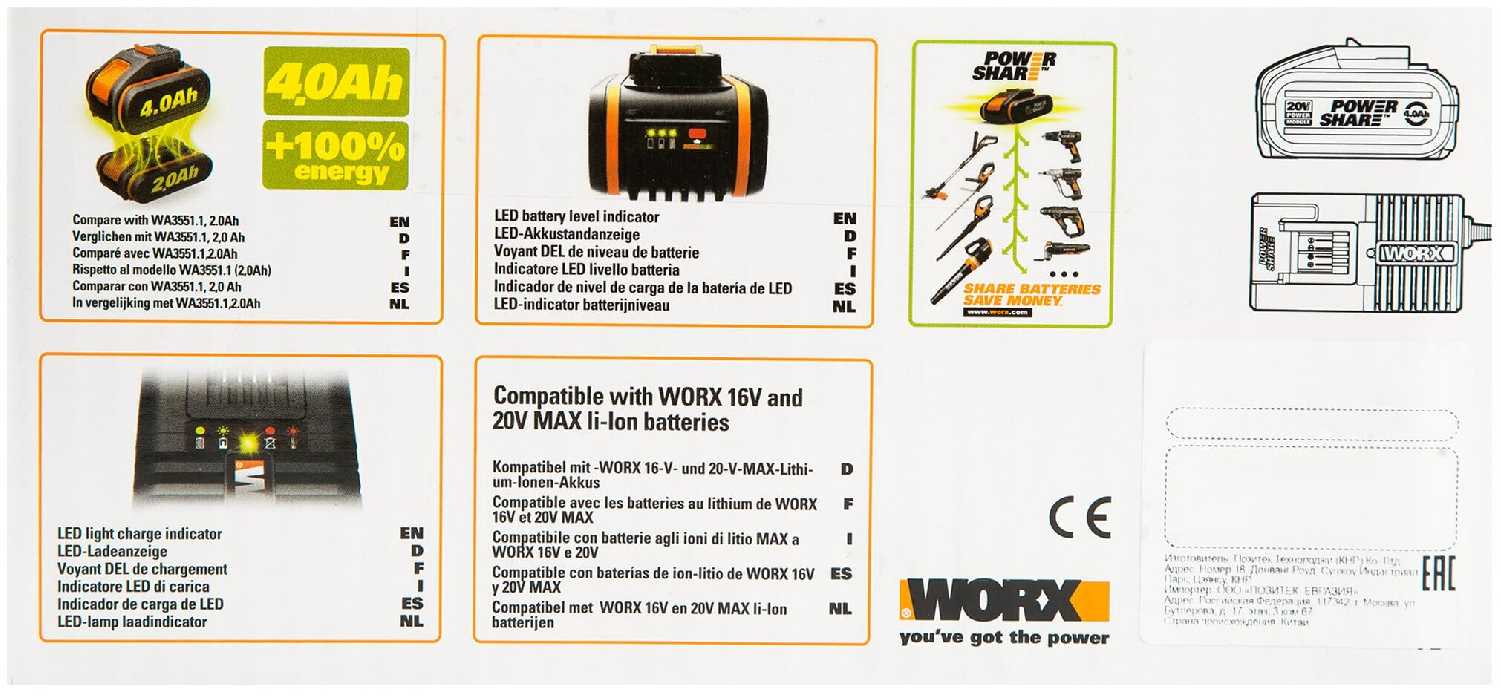 | Дополнительная информация : | 2 аккумулятора Li-Ion емкостью 4 А*ч WORX WA3553, Двойное зарядное устройство WORX WA3869, Коробка. |