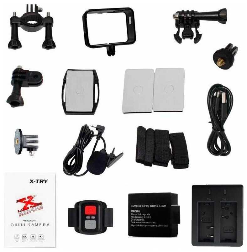 гермобокс, внешний микрофон, ПДУ, ремешок для ПДУ, рамка для монопода, универсальное крепление-защелка, переходник под штативный винт, универсальный винт с креплением, универсальный переходник, прямоугольная платформа с 3М-скотчем, прямоугольный двухсторонний 3М-скотч х 2 шт, универсальные ремешки х 4 шт., USB-кабель, автомобильное зарядное устройство 12В, 1А, крепление на стекло автомобиля (присоска), сетевое зарядное устройство 220В, зарядное устройство на 2 АКБ, дополнительная АКБ 900 mAh