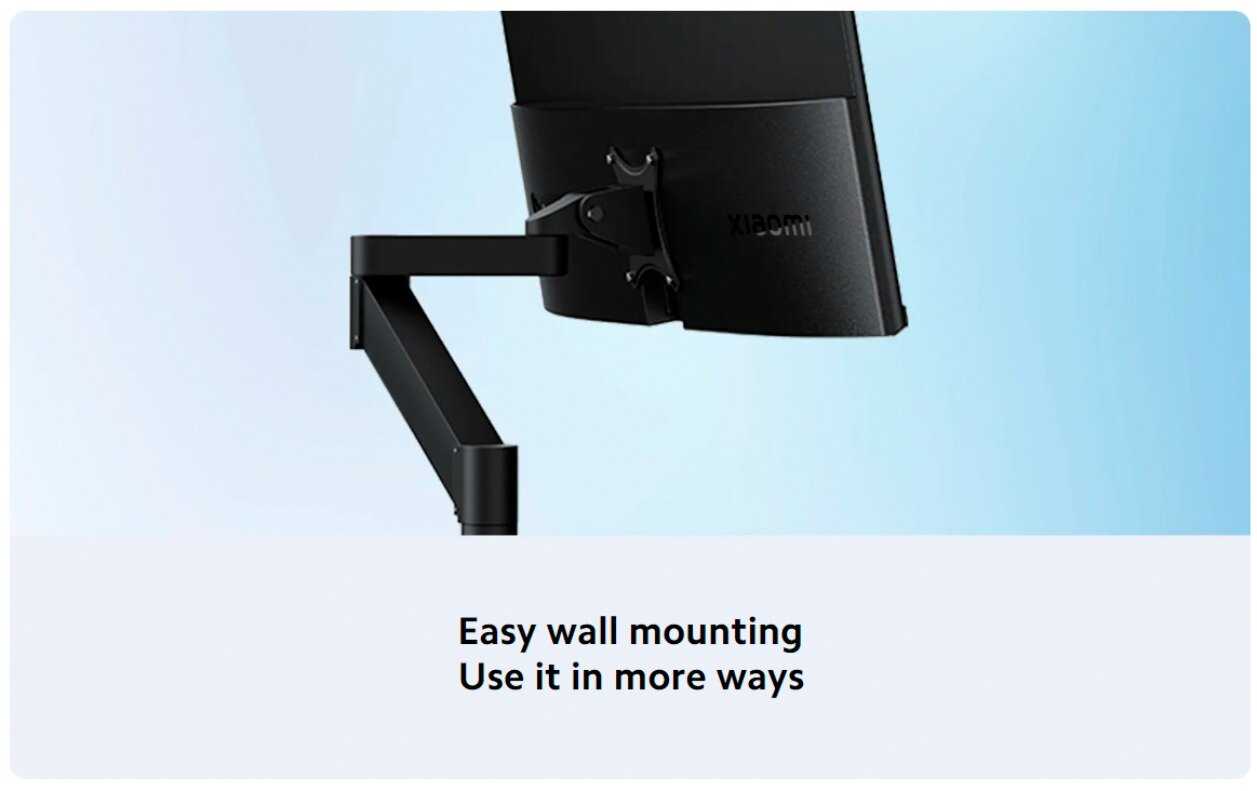 Конструкция и эргономика: Проблемы крепления и люфты: Ключевая претензия — люфт в узле крепления панели к подставке. У 30–40% экземпляров отмечается шатание монитора при касании или вибрации стола ("качается, как матрос при шторме"). Решение требует физического вмешательства: разборки основания, подтяжки гаек или подкладки прокладок. Регулировка наклона реализована неудобно: для изменения угла необходимо демонтировать монитор, ослаблять крепежные винты, выставлять положение и фиксировать его — процесс трудоемкий и рискованный для тонкой матрицы. Качество материалов: Подставка и элементы корпуса изготовлены из алюминия, что обеспечивает устойчивость, но рамки — матовый пластик, подверженный царапинам. Задняя панель маркая. Отмечается незначительный треск при нагреве компонентов на плате — распространенная особенность моделей Xiaomi. VESA-крепление: Совместимость с кронштейнами 100×100 мм присутствует, но установка осложнена выступающей центральной ножкой на тыльной стороне. Для монтажа требуются переходники или нестандартные кронштейны.