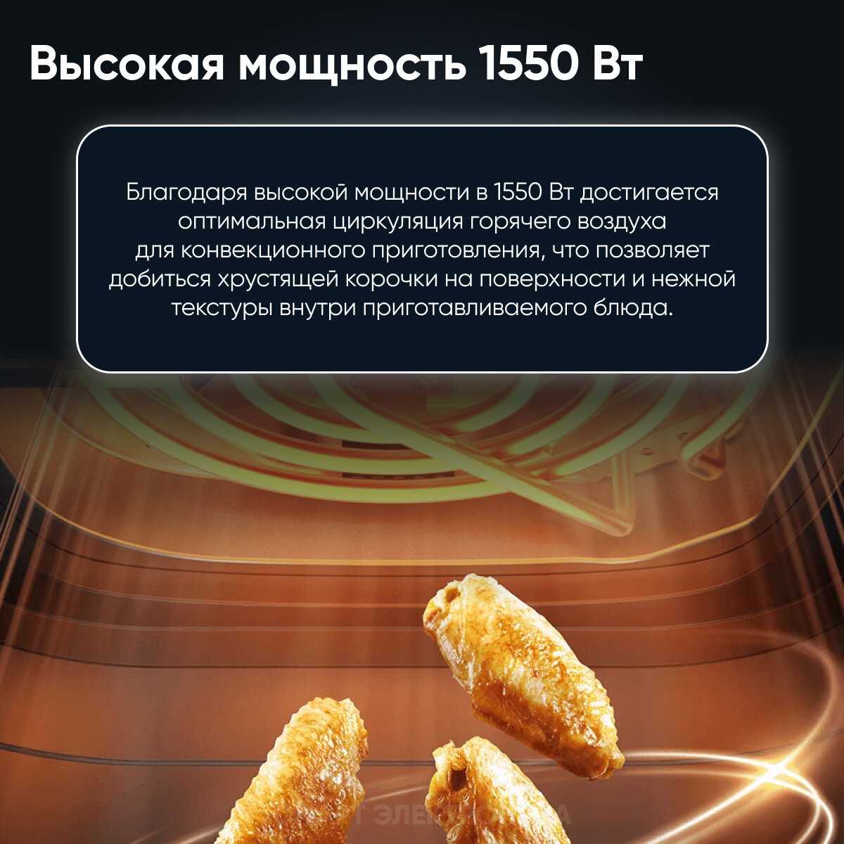 - Широкий диапазон температур и мощность подходят для разнообразных блюд, от разморозки до жарки.