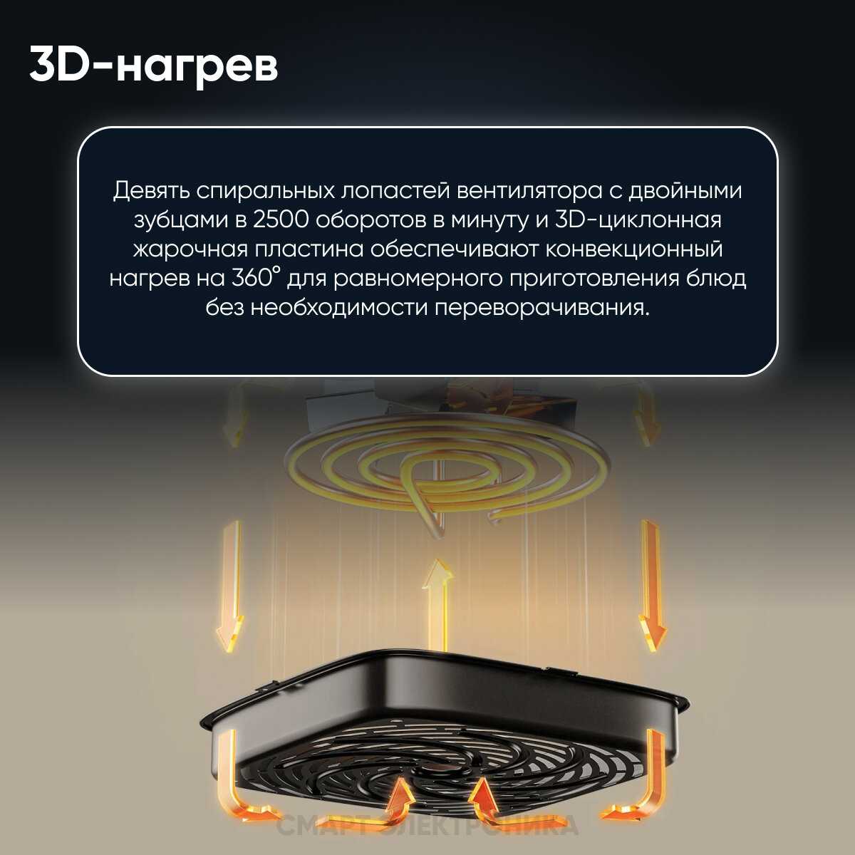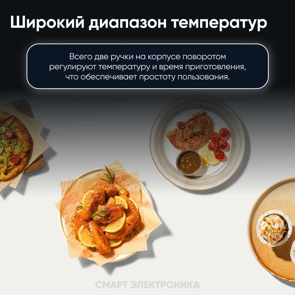 Максимальная температура достигает 200°C, хотя в описании иногда указывают 220°C, что не соответствует реальности. Пользователи подтверждают нагрев до 200°C для хрустящей корочки на мясе и овощах за 15–40 минут. Диапазон от низких значений позволяет размораживать продукты равномерно. Отзывы отмечают быстрый разогрев без перегрева снизу. Это достаточно для большинства блюд, но для высоких температур лучше духовка. -