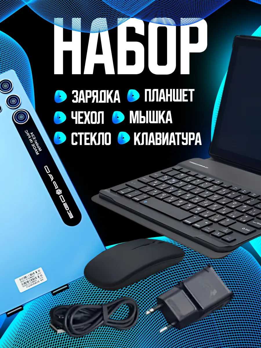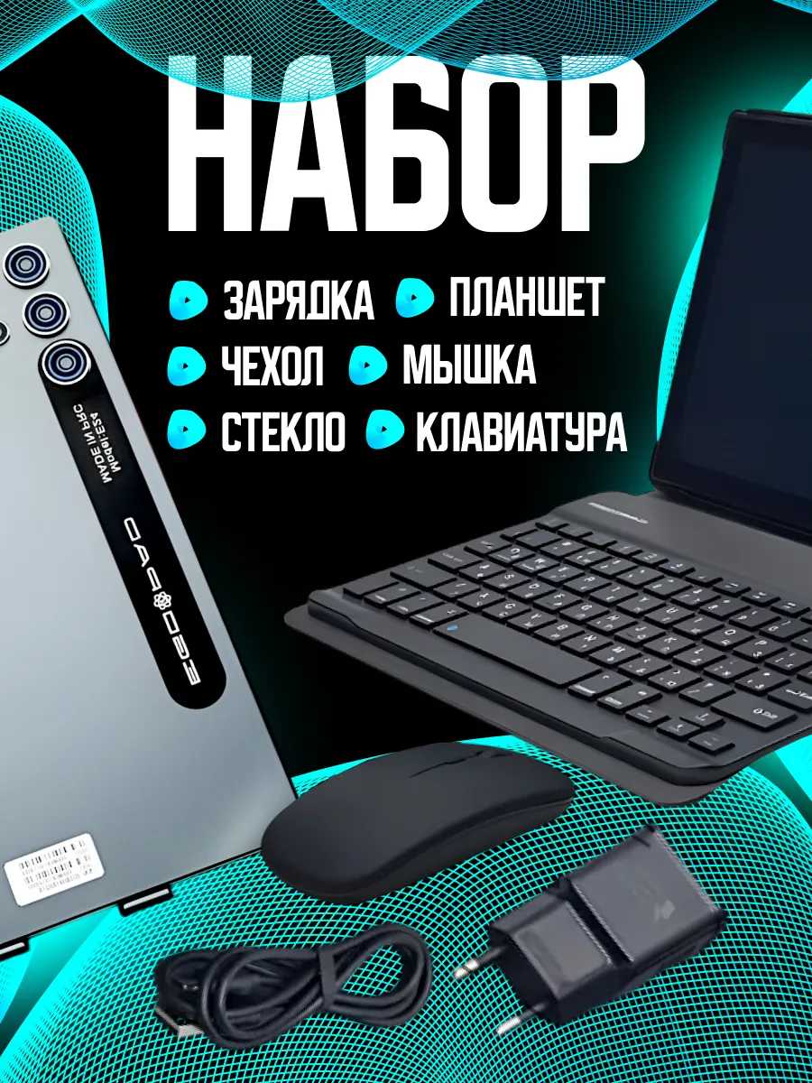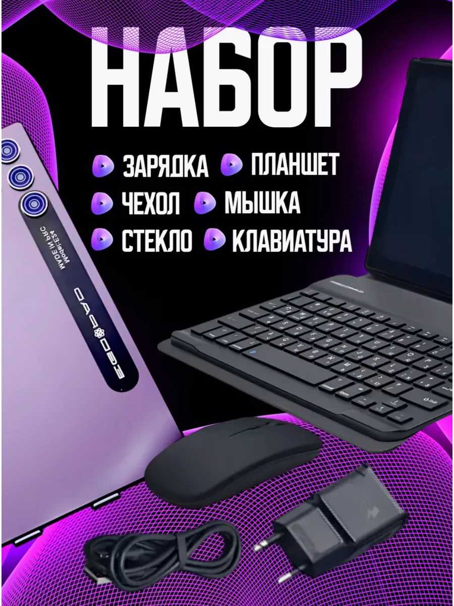- + В комплекте есть всё и чехол-подставка и защитное стекло и зарядка, мышка, клавиатура и даже флешка носитель, всё предусмотрено👍