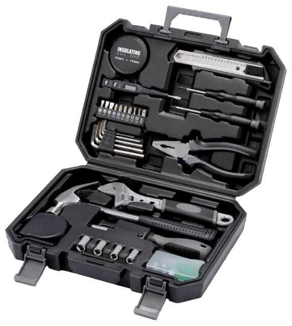 | Инструменты в комплекте : | ключ разводной, ключи гаечные, ключи имбусовые (шестигранные), молоток, отвёртки, отвёртки для точных работ, пассатижи, плоскогубцы, рукоять для бит |