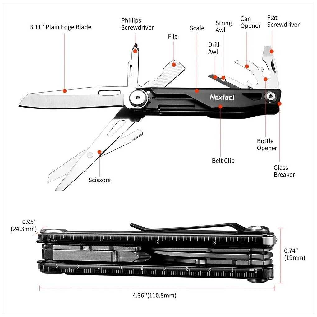 - + нож и ножницы с надёжным фиксатором. можная крестообразная отвёртка. линейка. удобное крепление в кармане. подходит для открывания консервов. хорошая заточка ножа. сталь очень хорош.