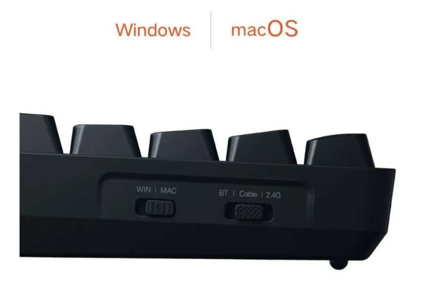 Поддержка MacOS реализована на аппаратном уровне: есть переключатель Win/Mac и пиктограммы командной клавиши. При подключении к Mac автоматически переназначаются клавиши Alt и Win, но для активации F-ряда требуется настройка в системе. С Android-устройствами работает только в режиме Bluetooth. -