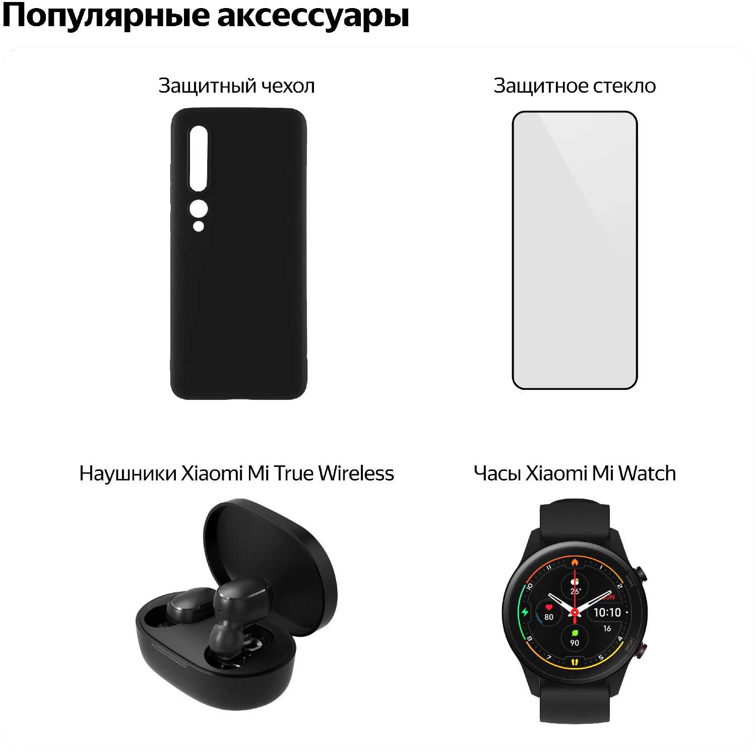 смартфон Xiaomi Mi 10, адаптер питания, кабель USB Type-C, переходник Type-c на 3, 5 мм разъем для наушников, защитный чехол, скрепка для извлечения SIM-карты, руководство пользователя, гарантийный талон