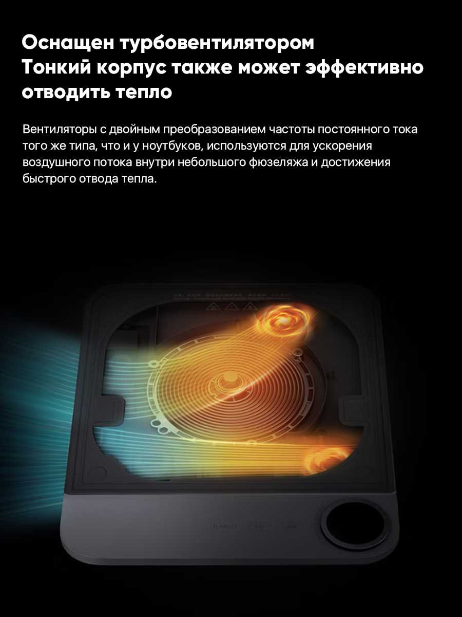 Толщина плиты составляет всего несколько сантиметров, что делает ее чрезвычайно компактной и удобной для хранения и транспортировки. Круглая форма и минималистичный дизайн позволяют устройству органично вписываться в современный интерьер кухни, не занимая много места на рабочей поверхности. Компактные размеры и небольшой вес делают плиту идеальным решением для дачи, путешествий или использования в условиях ограниченного пространства. -