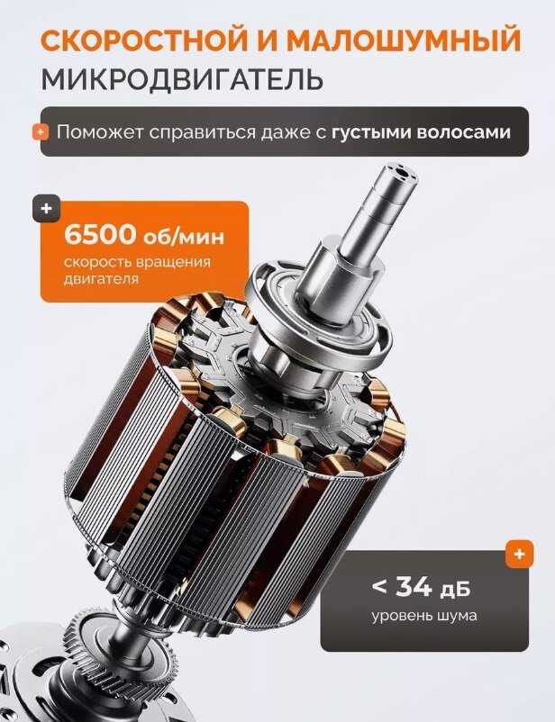 - Наличие регулировочной насадки позволяет контролировать длину оставляемых волос.