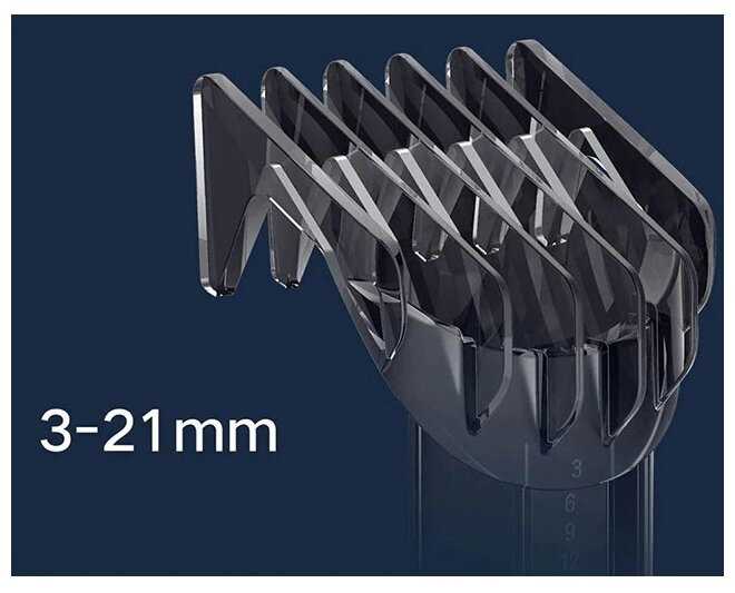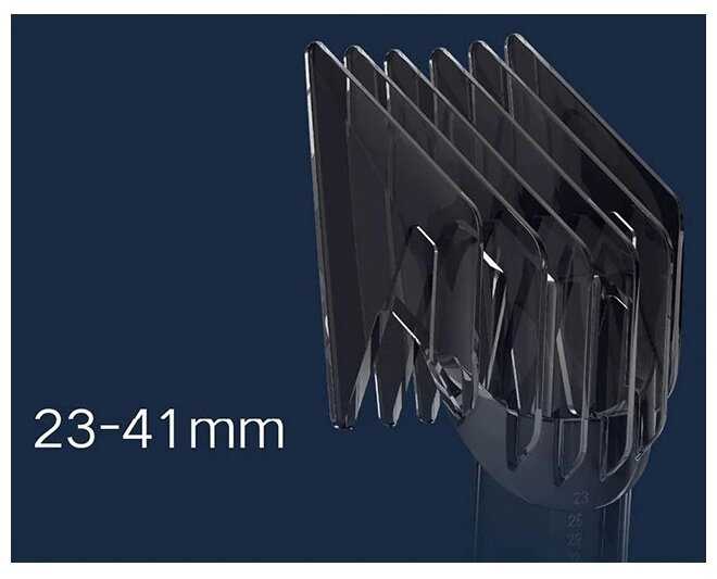 - Регулировка длины от 0.5 до 1.7 мм (без насадок) позволяет подстраивать машинку под индивидуальные предпочтения, включая бритье под «ноль».