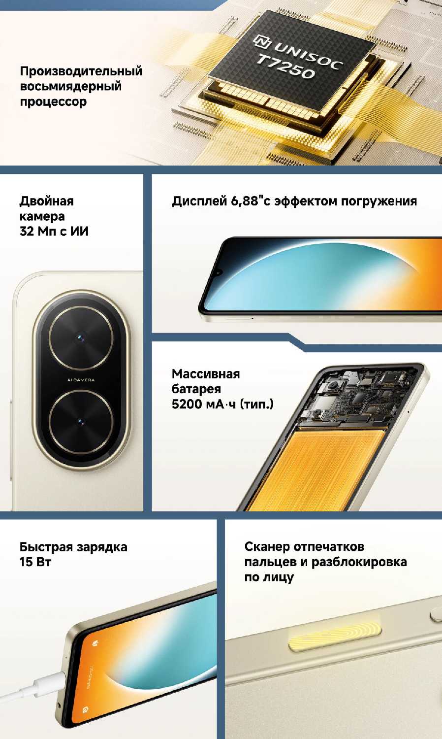 Производительность смартфона оценивается пользователями как достойная для базовых задач. Он уверенно справляется с социальными сетями, мессенджерами, просмотром видео в YouTube и VK, а также с простыми приложениями. Некоторые пользователи отмечают незначительные подтупливания при запуске приложений или при работе с более чем тремя вкладками одновременно, но в целом система работает плавно, особенно учитывая ценовой сегмент. Процессор обеспечивает достаточную мощность для повседневной эксплуатации без серьезных лагов. -