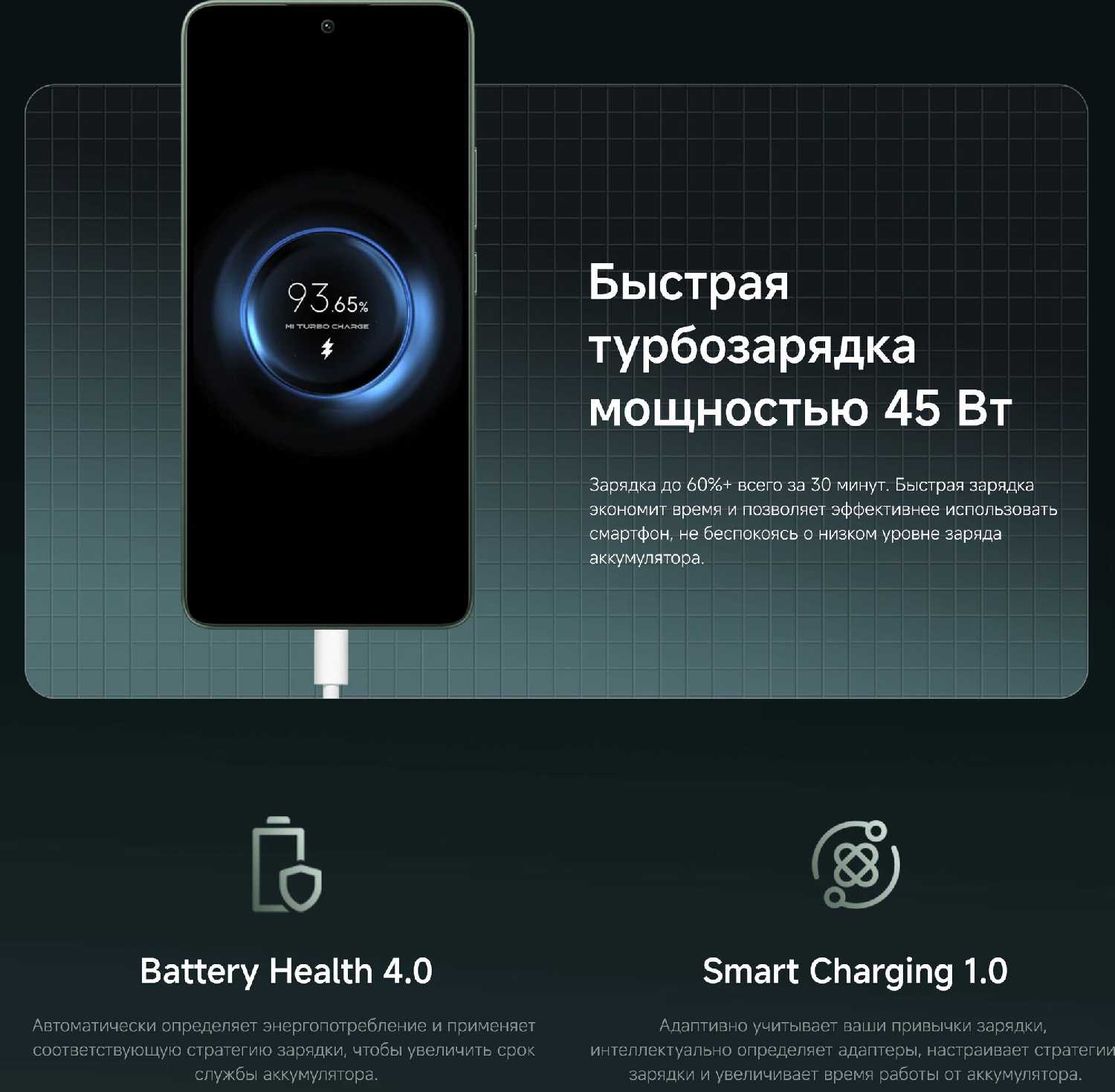 - Ёмкий аккумулятор с поддержкой 45 Вт турбозарядки: